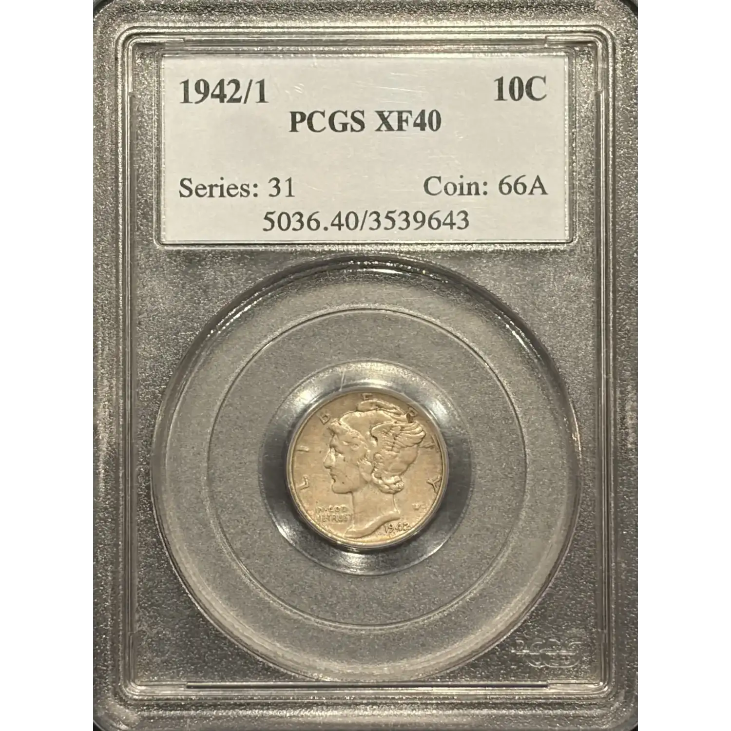 505536 | 1942/1-VF-35 Dimes Winged Liberty Head or Mercury PCGS VF-35 | PCGS | VF-35 | Sold: 01/01/2011 | $510 |