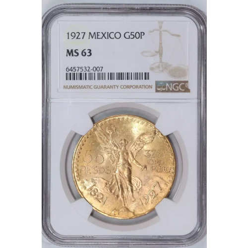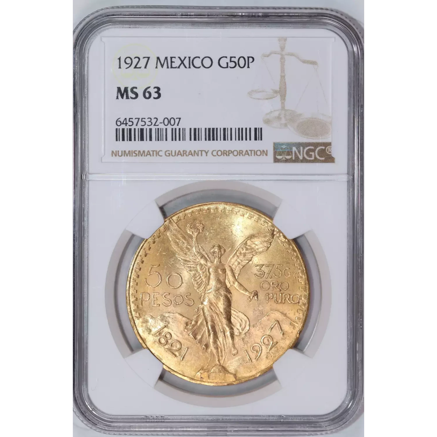 1927 MEXICO GOLD 50 PESOS NGC MS63