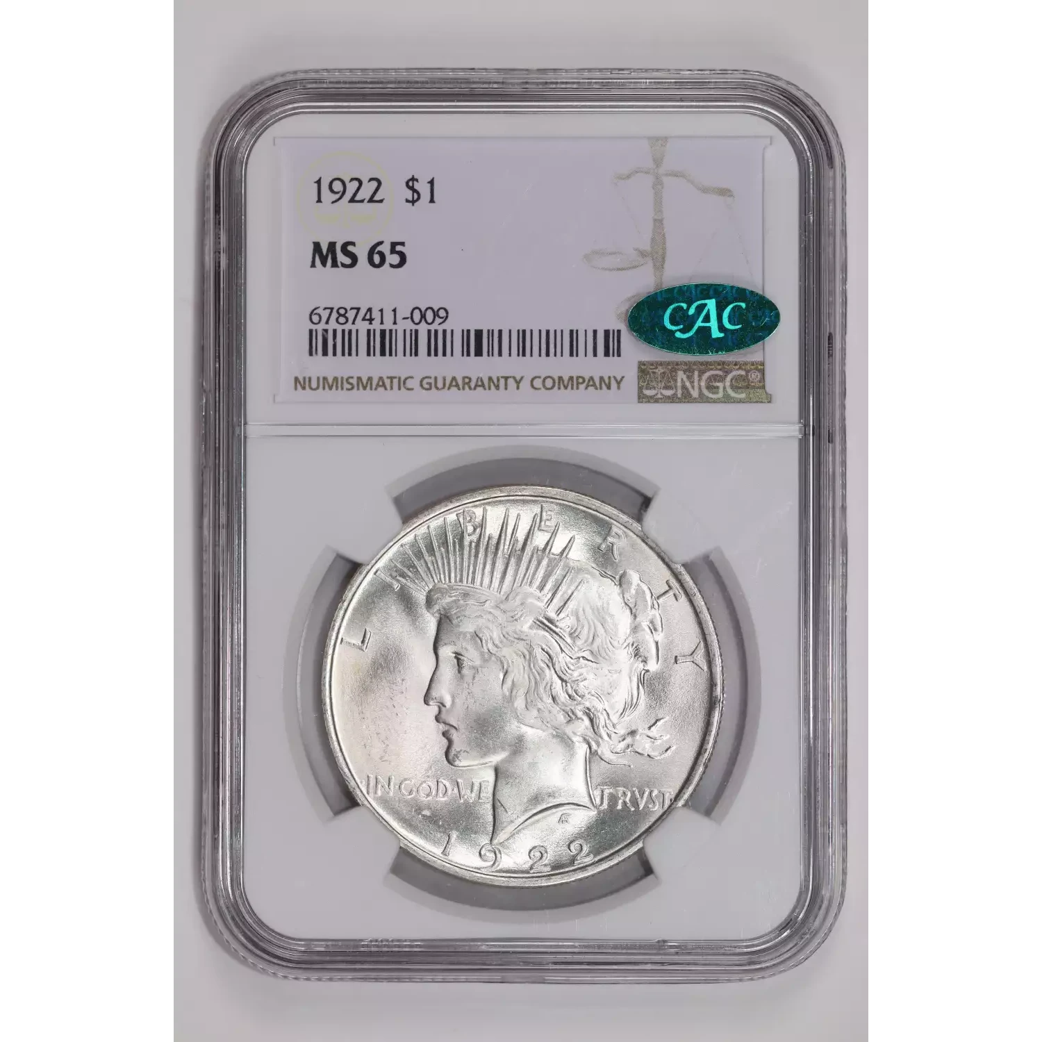 1922 PEACE DOLLAR NGC MS65 CAC - LOOKS NICER! VERY PQ!
