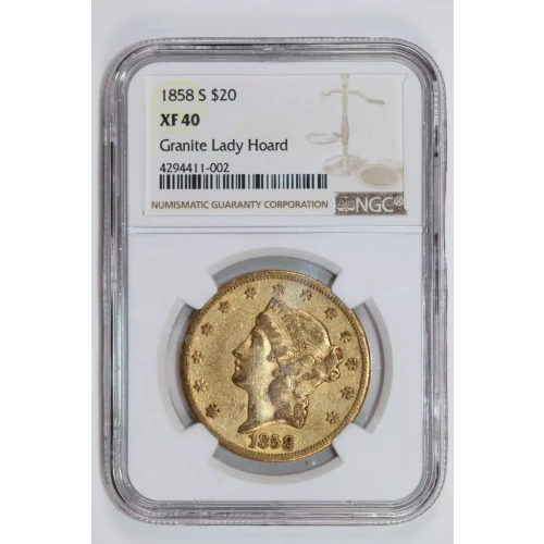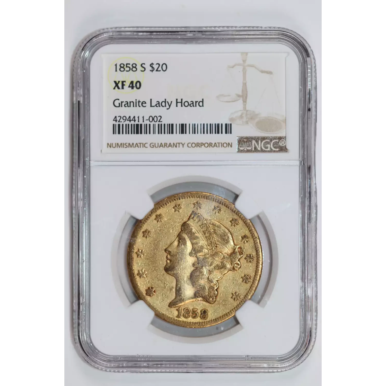 1858-S $20 GOLD LIBERTY DOUBLE EAGLE NGC XF40 GRANITE LADY HOARD