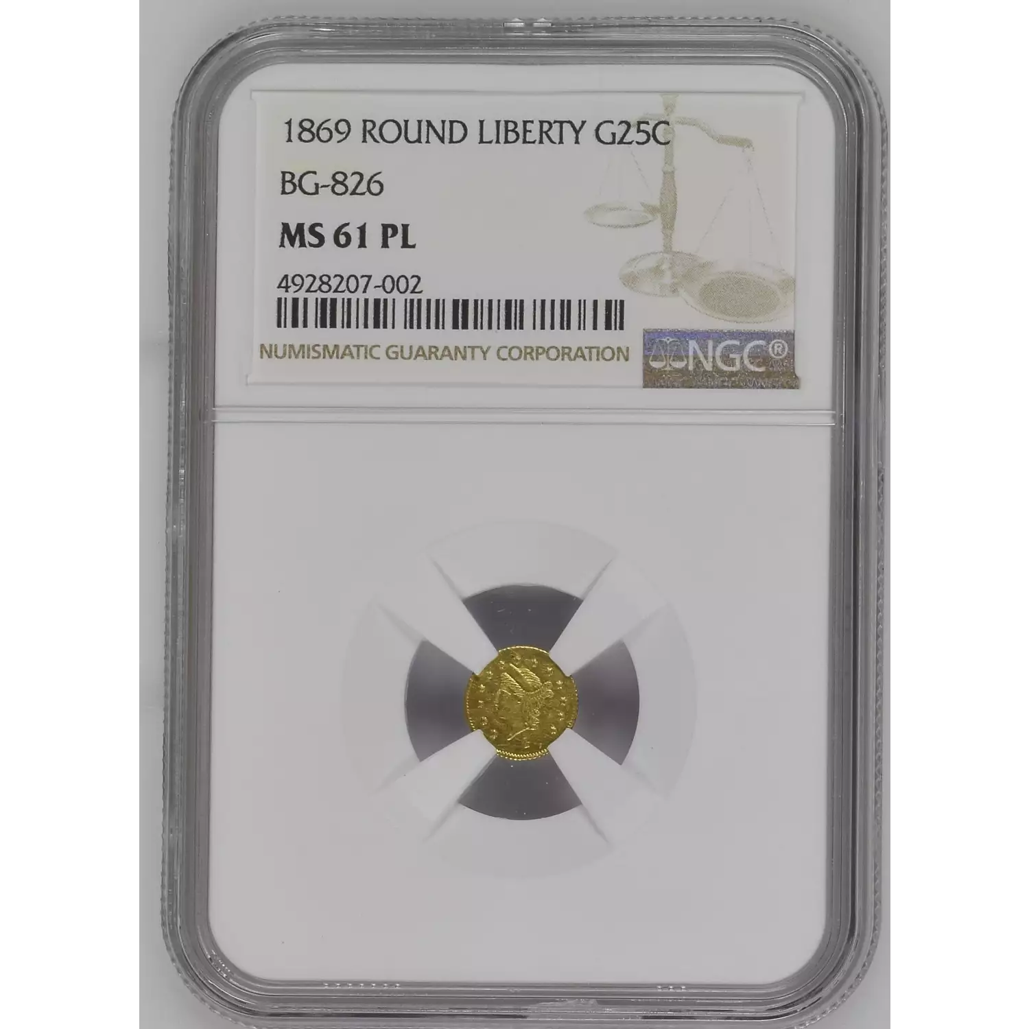 1869 ROUND LIBERTY FRACTIONAL GOLD QUARTER BG-826 NGC MS61 PL
