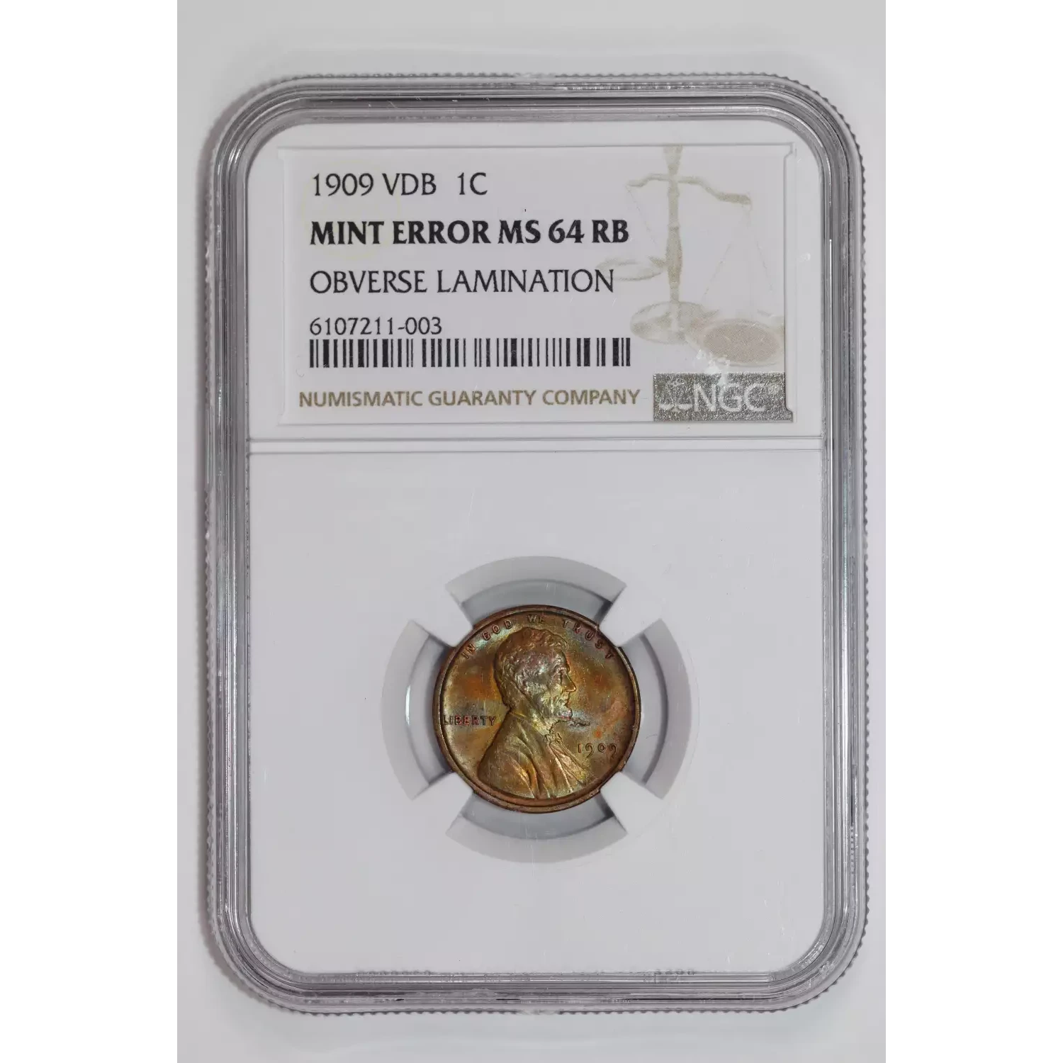 1909 VDB LINCOLN CENT NGC MS64 RB - MINT ERROR! OBVERSE LAMINATION!