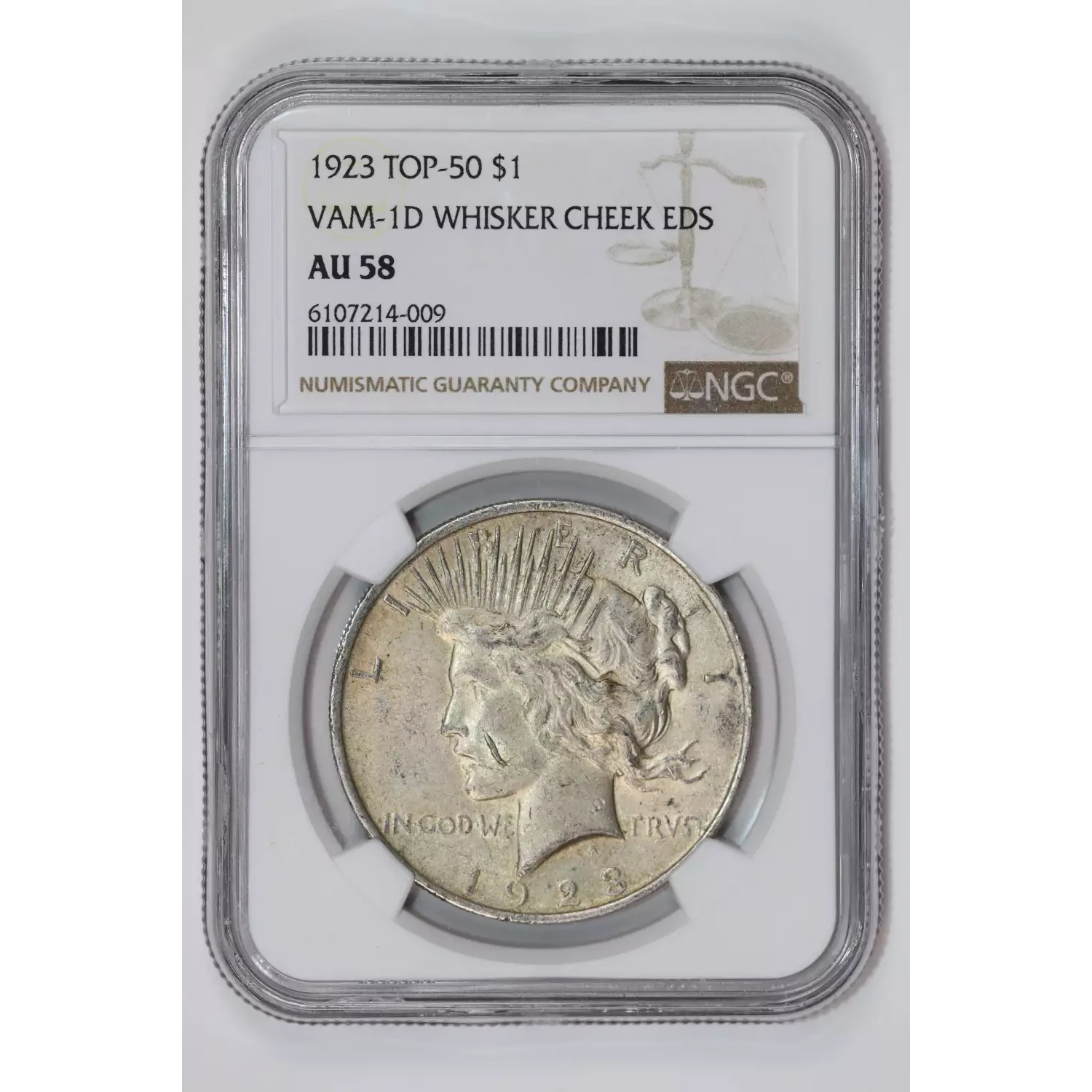 1923 VAM-1D WHISKER CHEEK EDS TOP 50 PEACE DOLLAR NGC AU58