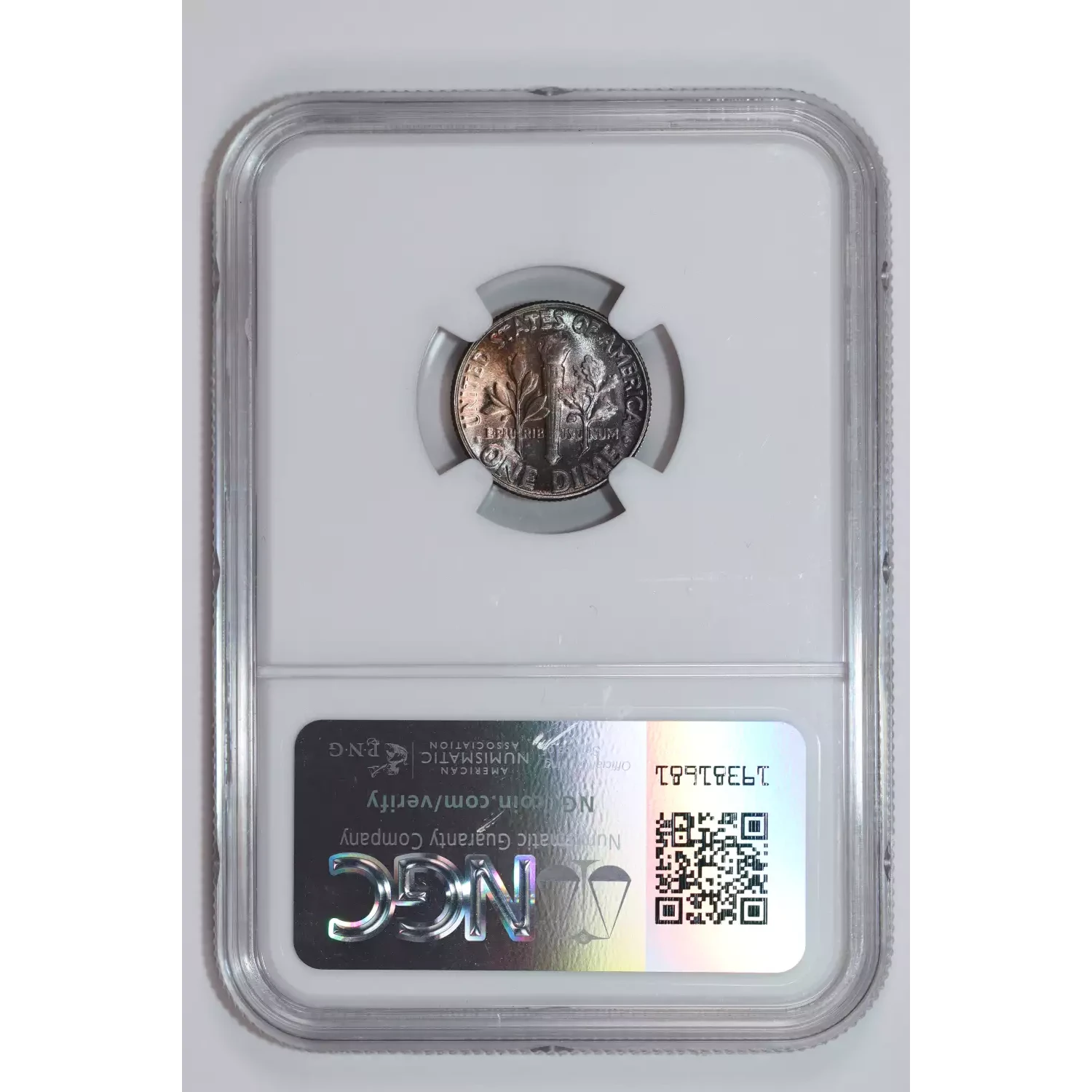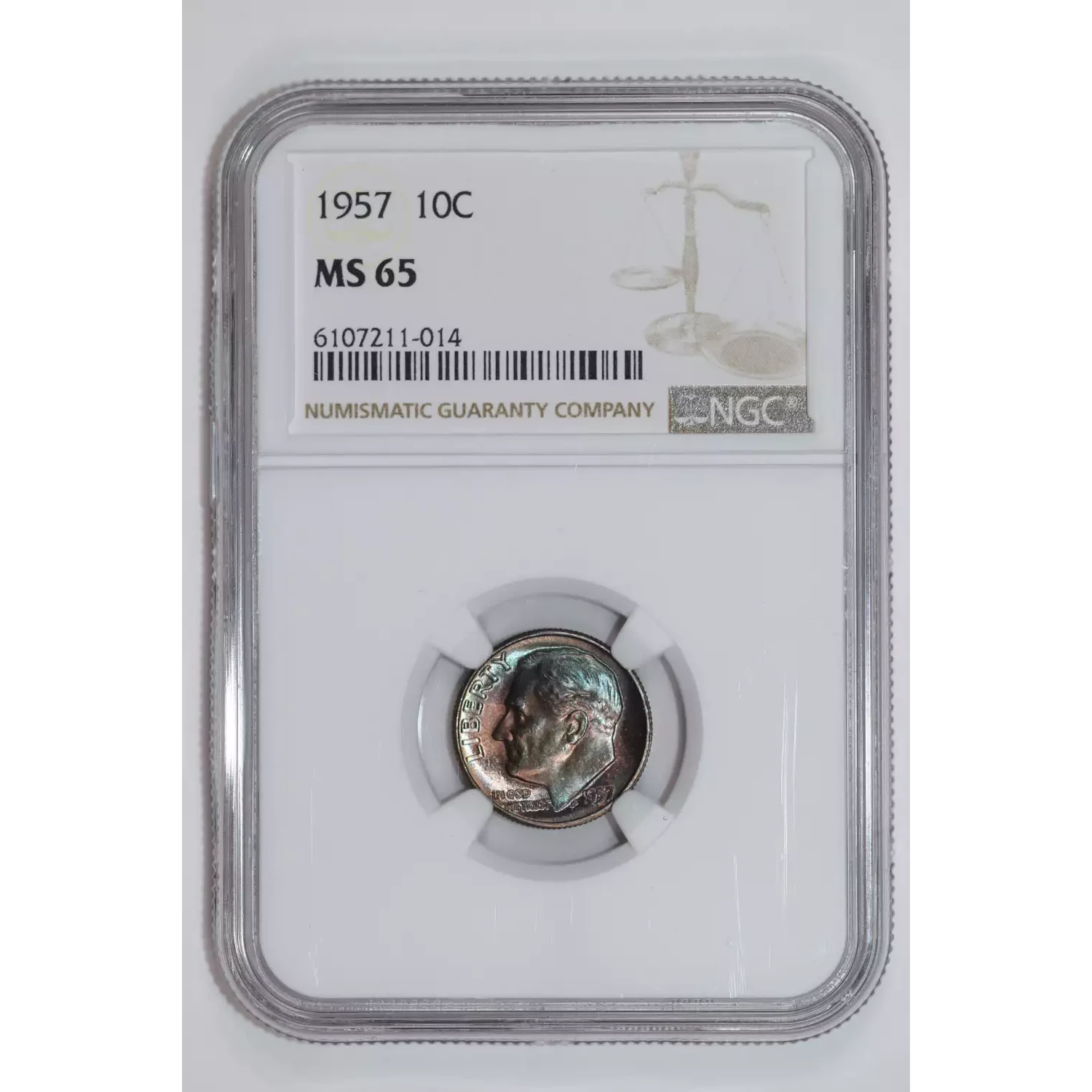 1957 ROOSEVELT DIME NGC MS65 PRETTY PASTEL RED/BLUE TONING!
