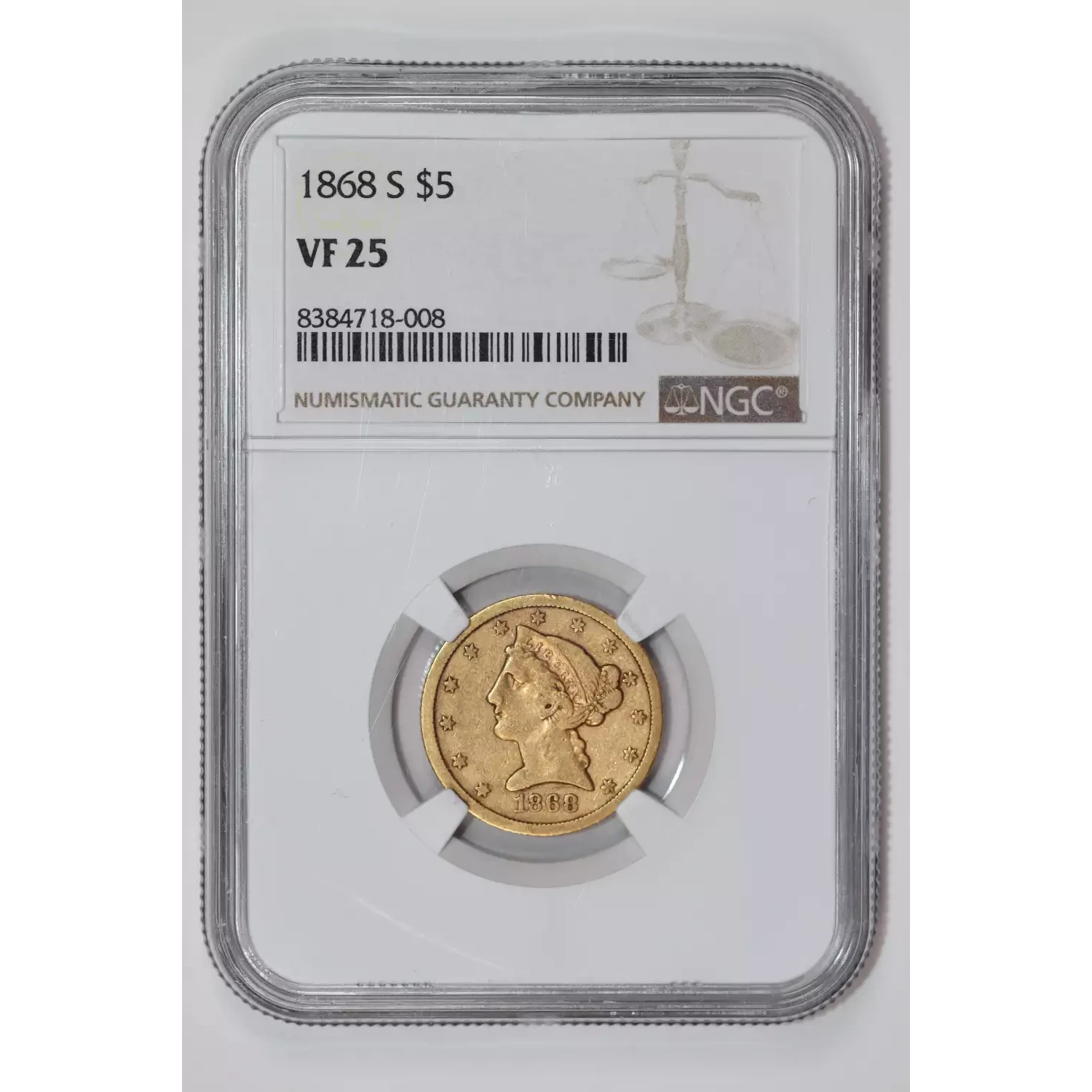 1868-S $5 GOLD LIBERTY HALF EAGLE NGC VF25 - ONLY 52,000 MINTED!