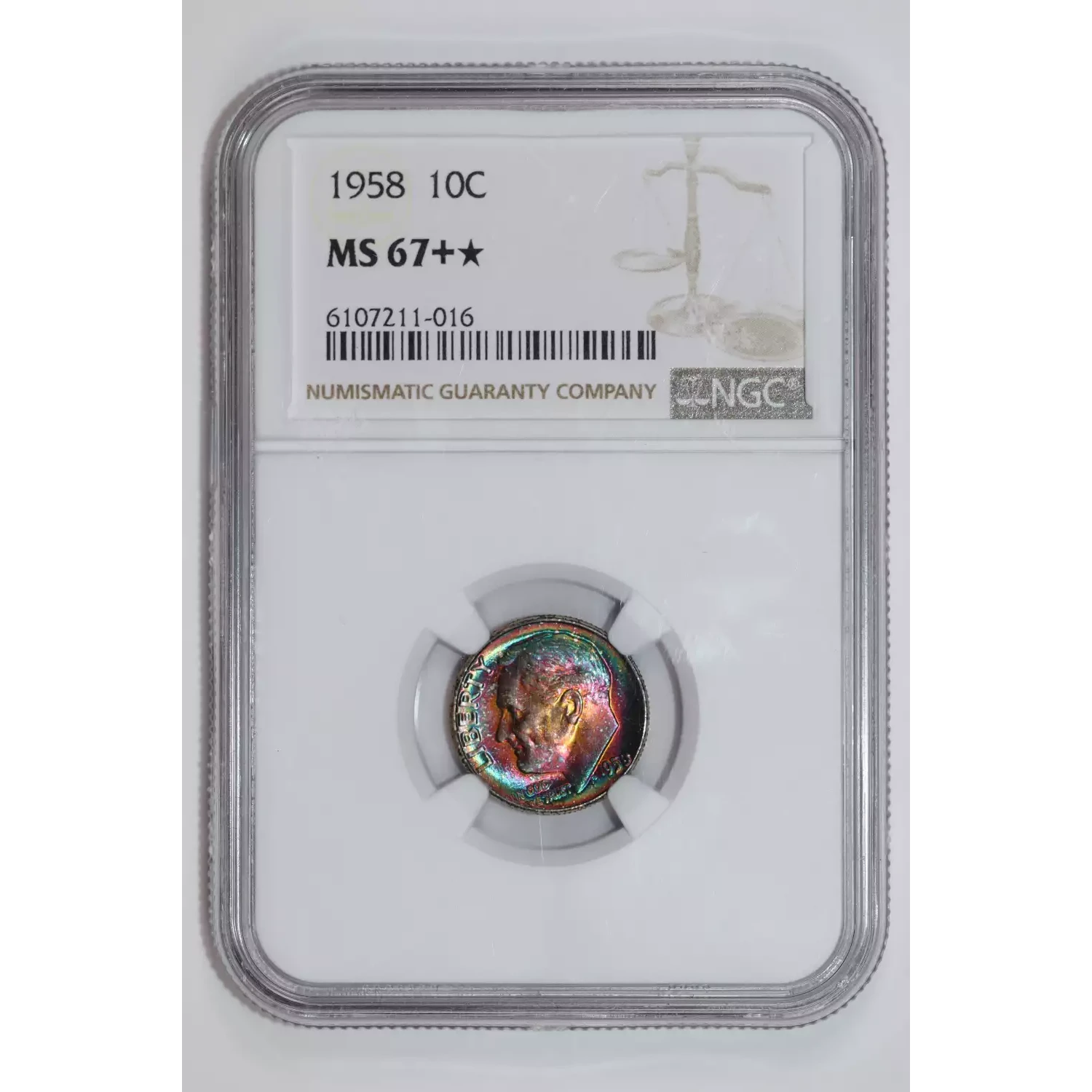1958 ROOSEVELT DIME NGC MS67+* STAR MONSTER RAINBOW TONED! VIBRANT!