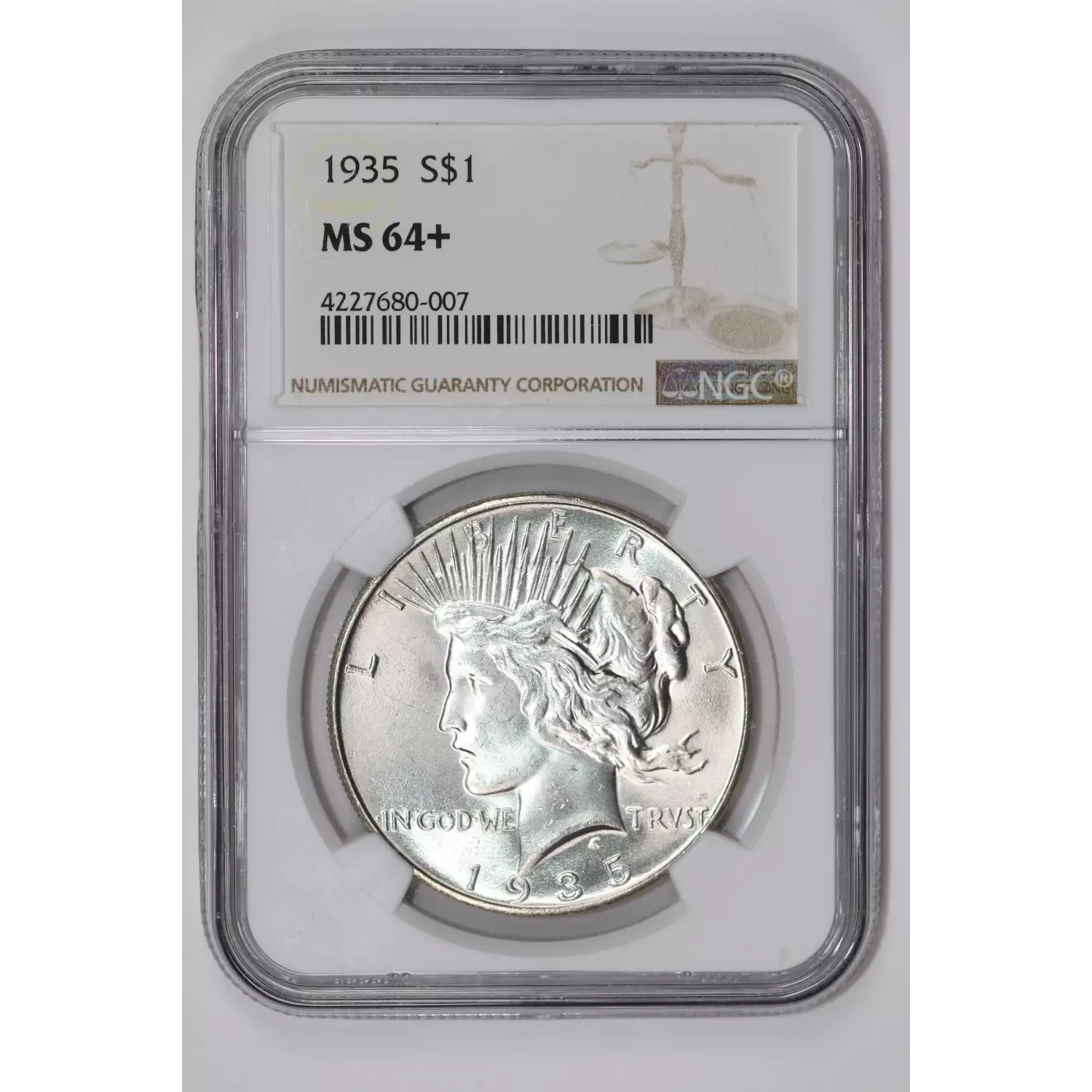 1935 PEACE DOLLAR NGC MS64+ VERY PQ! LOOKS NICER!