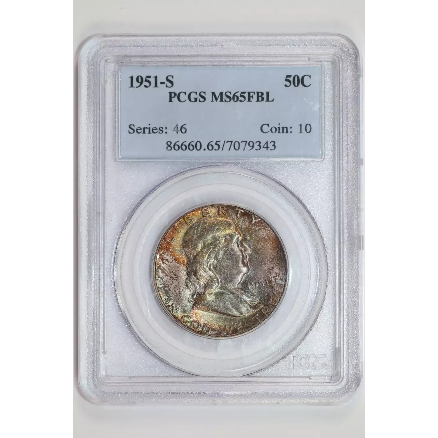 1951-S FRANKLIN HALF DOLLAR PCGS MS65 FBL PRETTY COLOR!