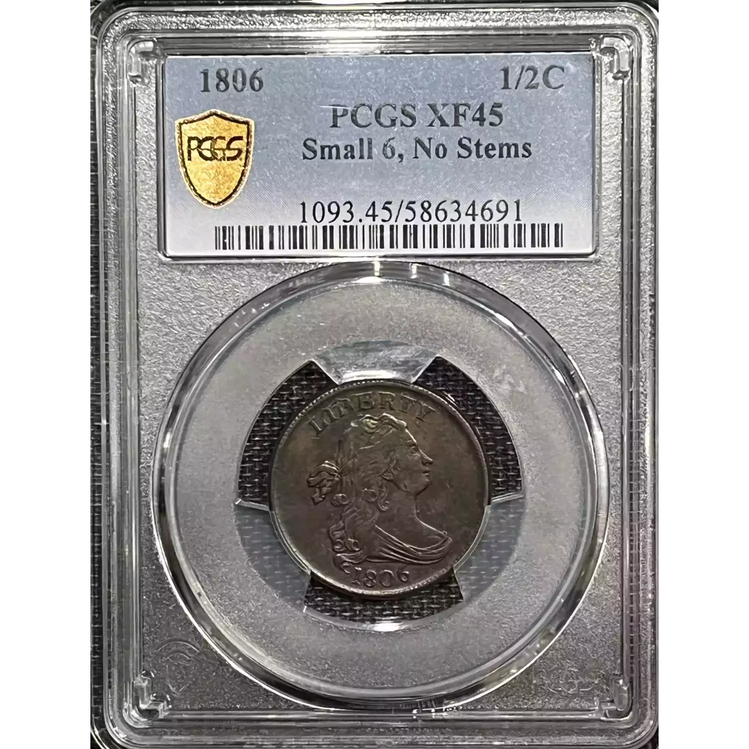 1806 DRAPED HALF CENT SMALL 6, NO STEMS PCGS XF45