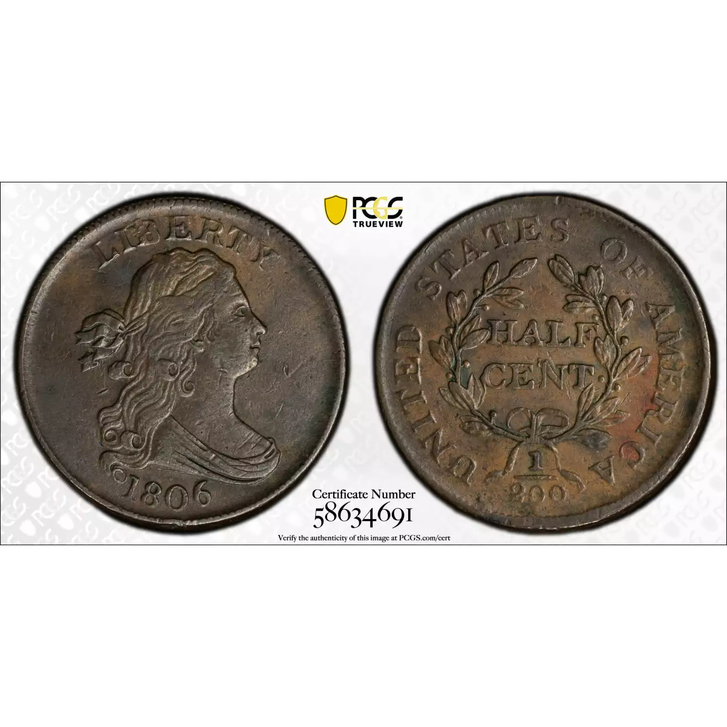 1806 Half Cents Draped Bust 1800 - 08 Copper PCGS XF-45 BN Small 6, No Stems