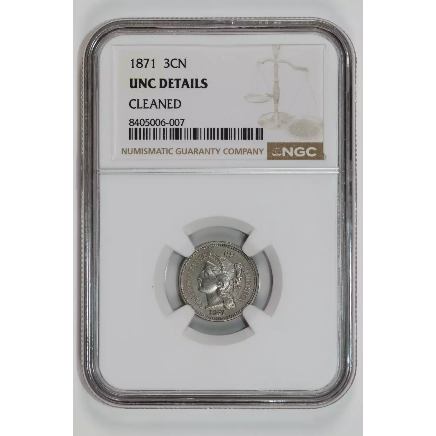1871 THREE CENT NICKEL NGC UNC DETAILS
