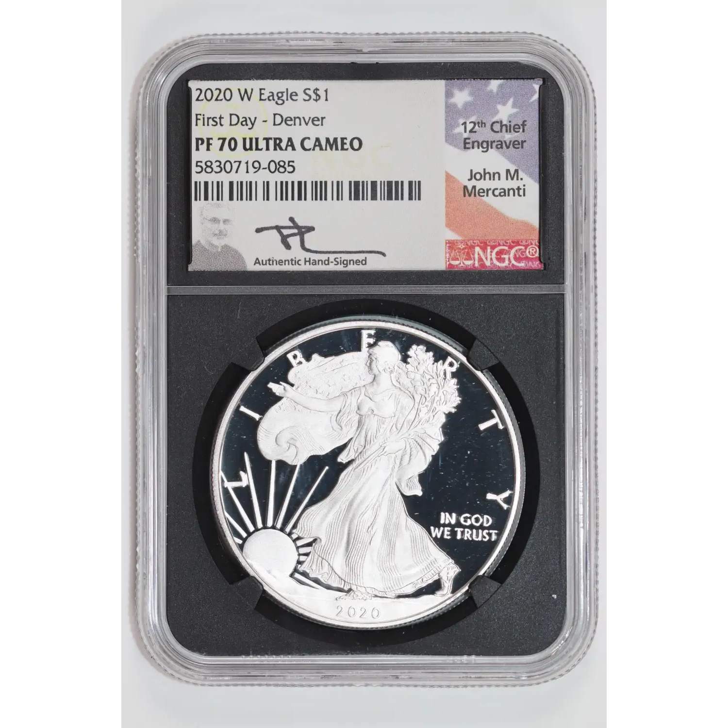 2020-W PROOF SILVER EAGLE FIRST DAY DENVER NGC PR70 UCAM MERCANTI