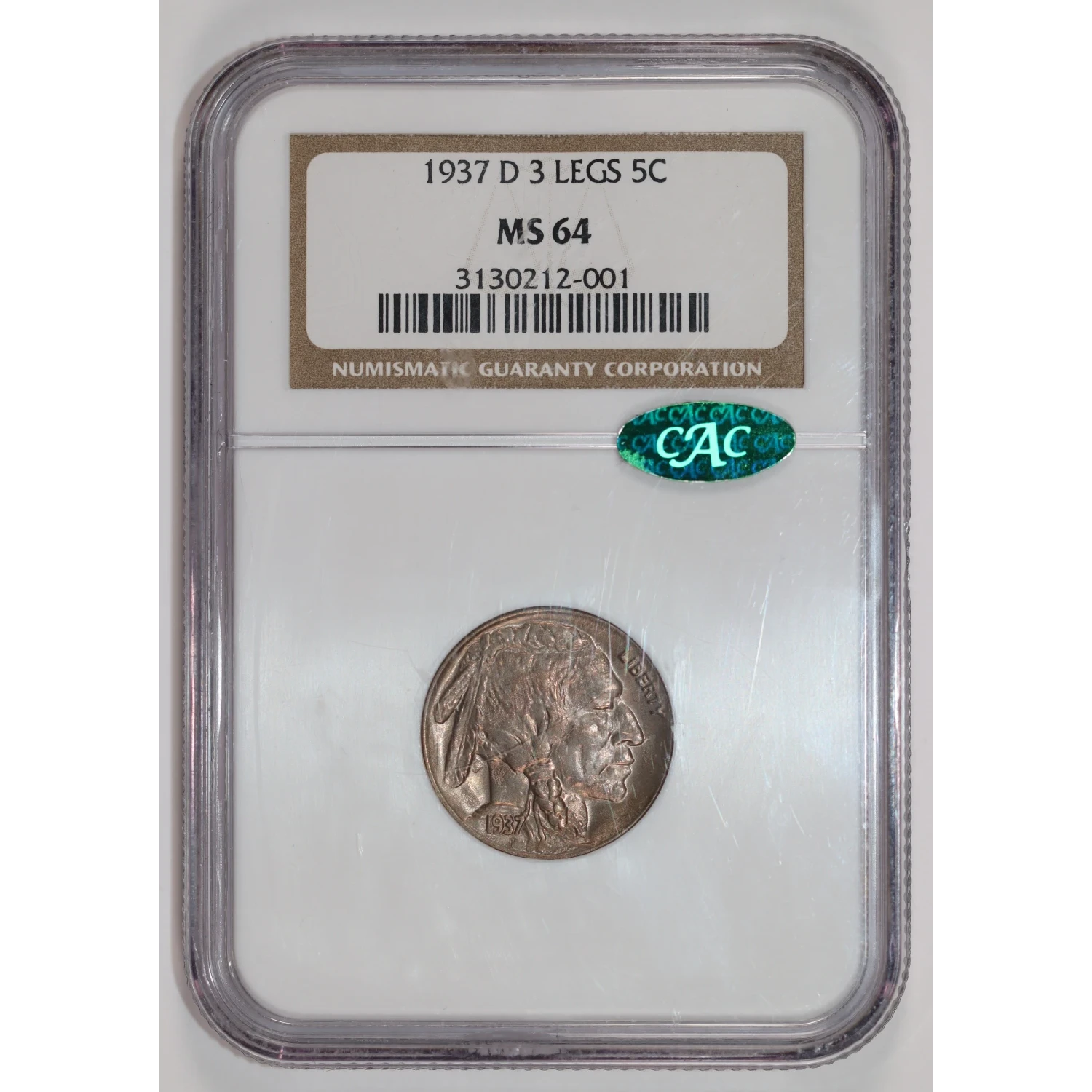 1937-D 3 LEGS THREE LEGGED BUFFALO NICKEL NGC MS64 CAC - VERY PQ!!