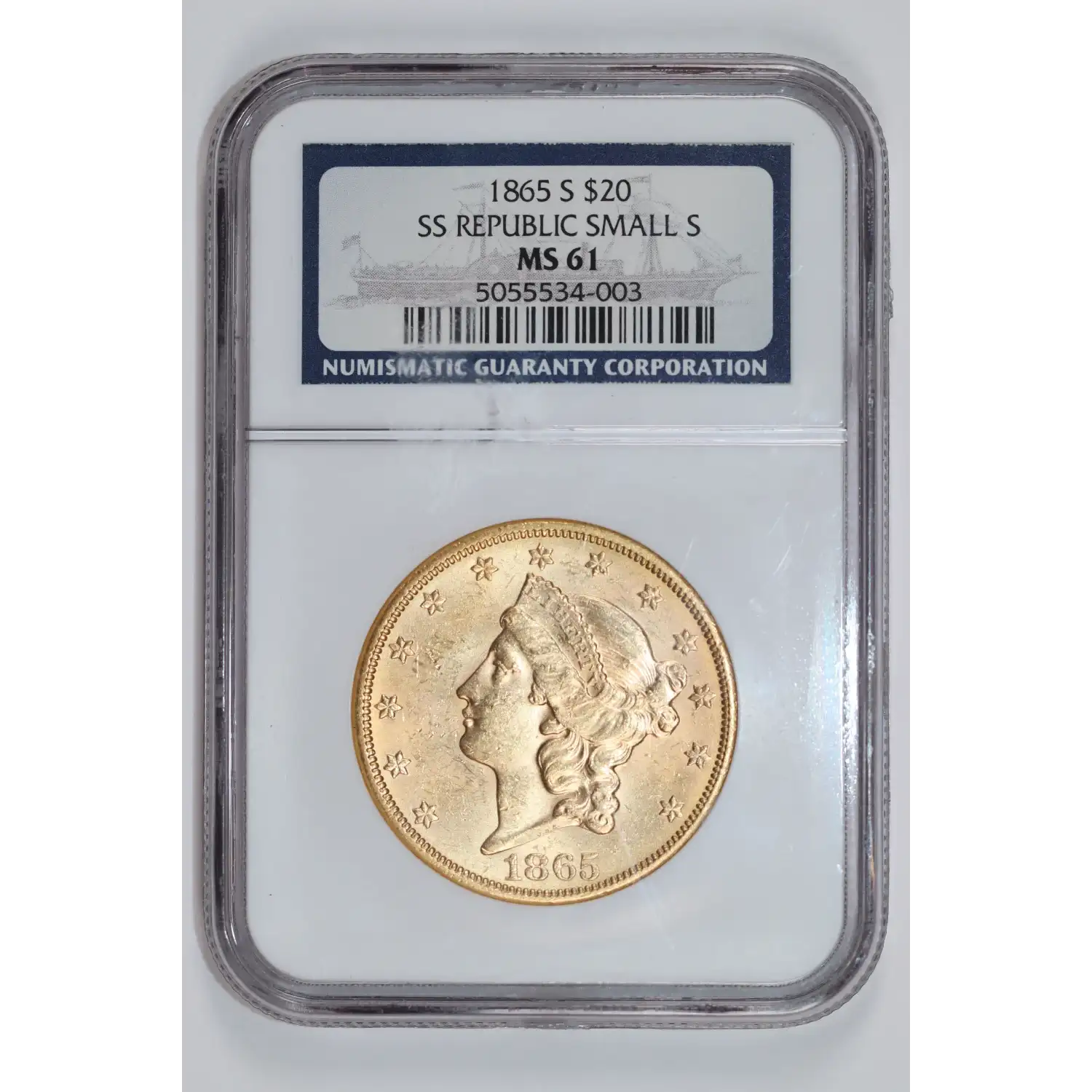 1865-S $20 GOLD LIBERTY DOUBLE EAGLE SS REPUBLIC SMALL S NGC MS61