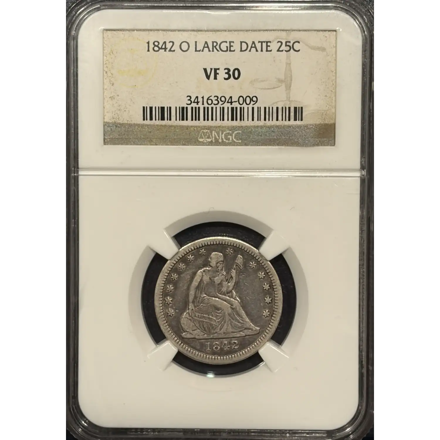 1842-O SEATED LIBERTY QUARTER LARGE DATE NGC VF30