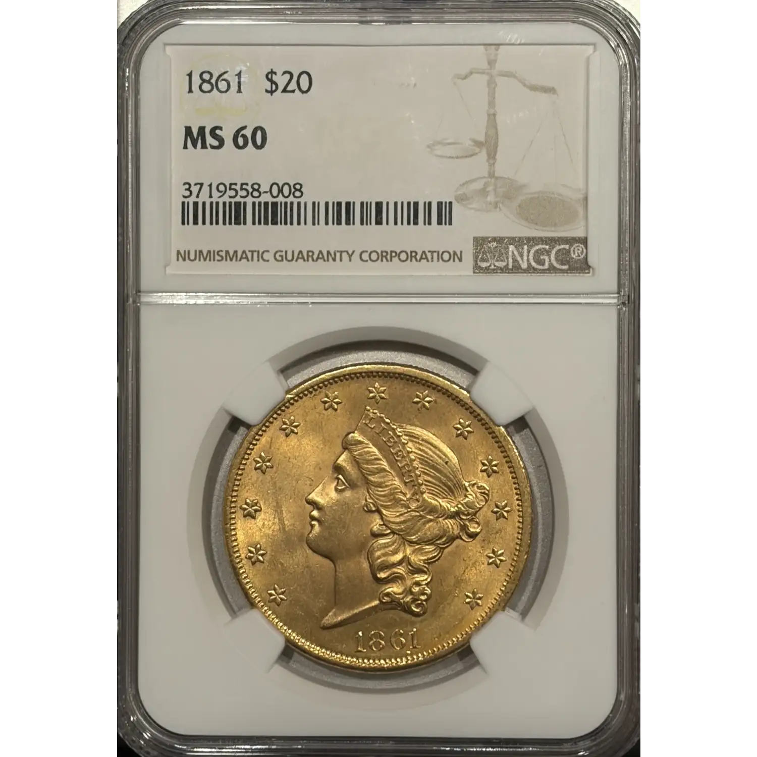 1861 $20 GOLD LIBERTY DOUBLE EAGLE NGC MS60