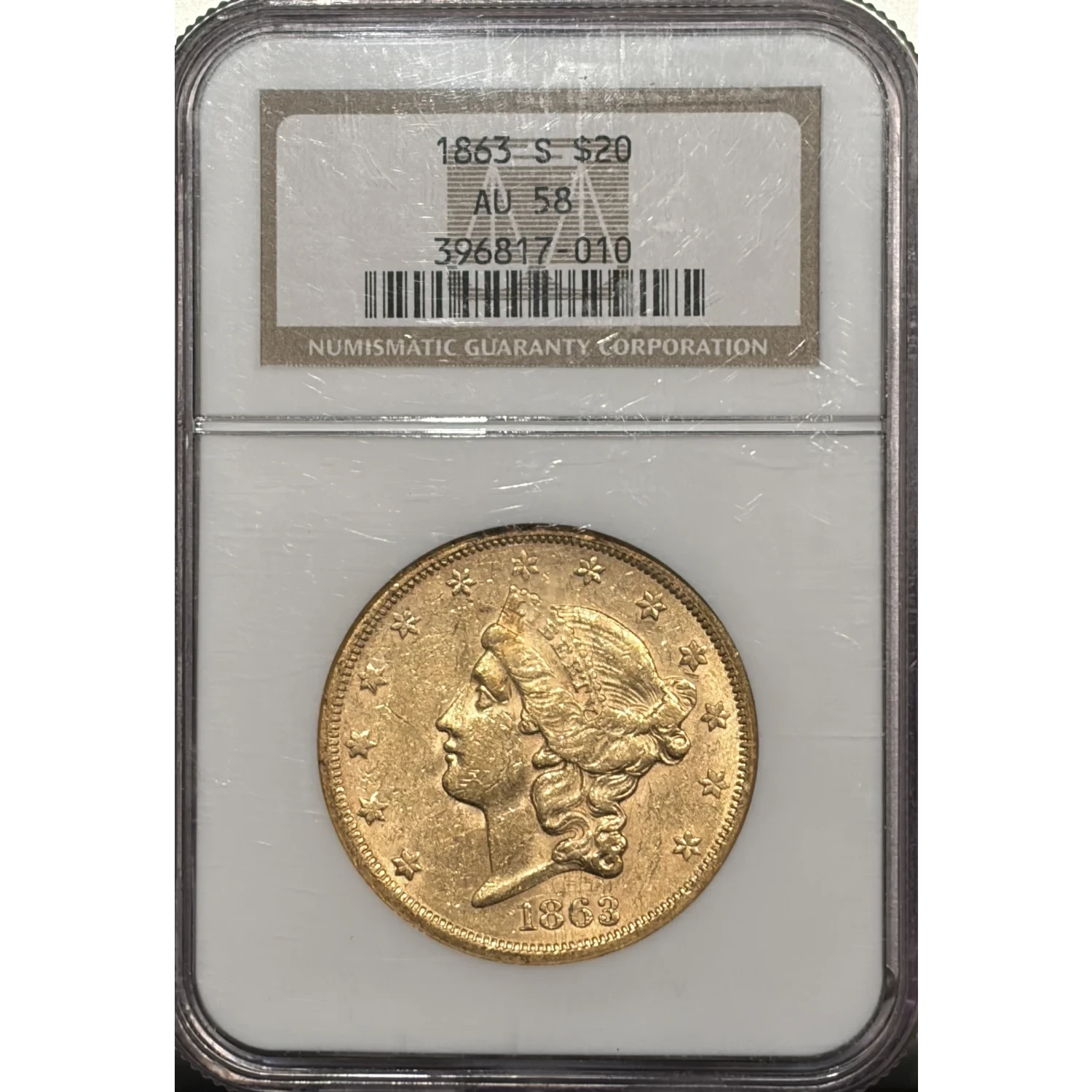 1863-S $20 GOLD LIBERTY DOUBLE EAGLE NGC AU58
