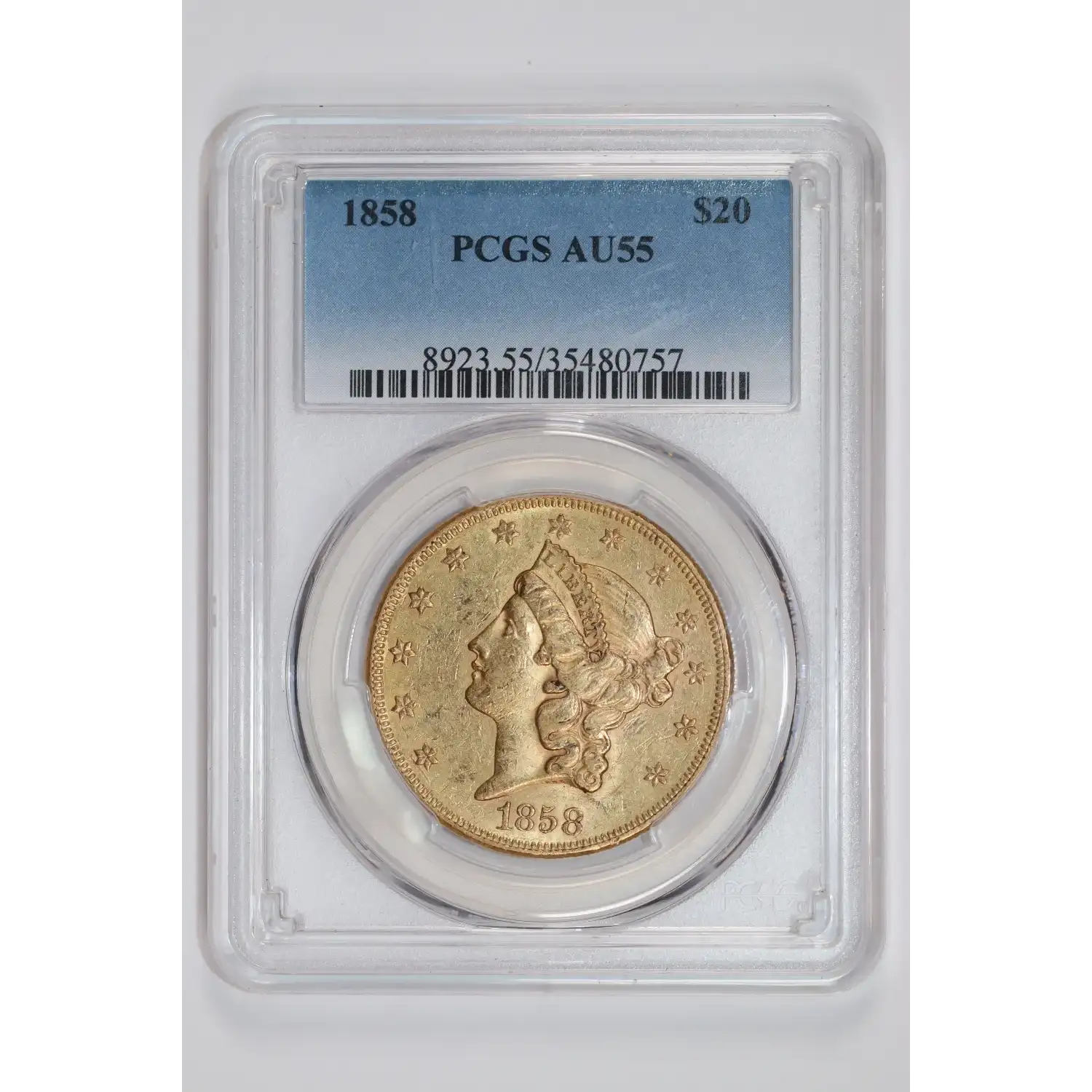1858 $20 GOLD LIBERTY DOUBLE EAGLE PCGS AU55
