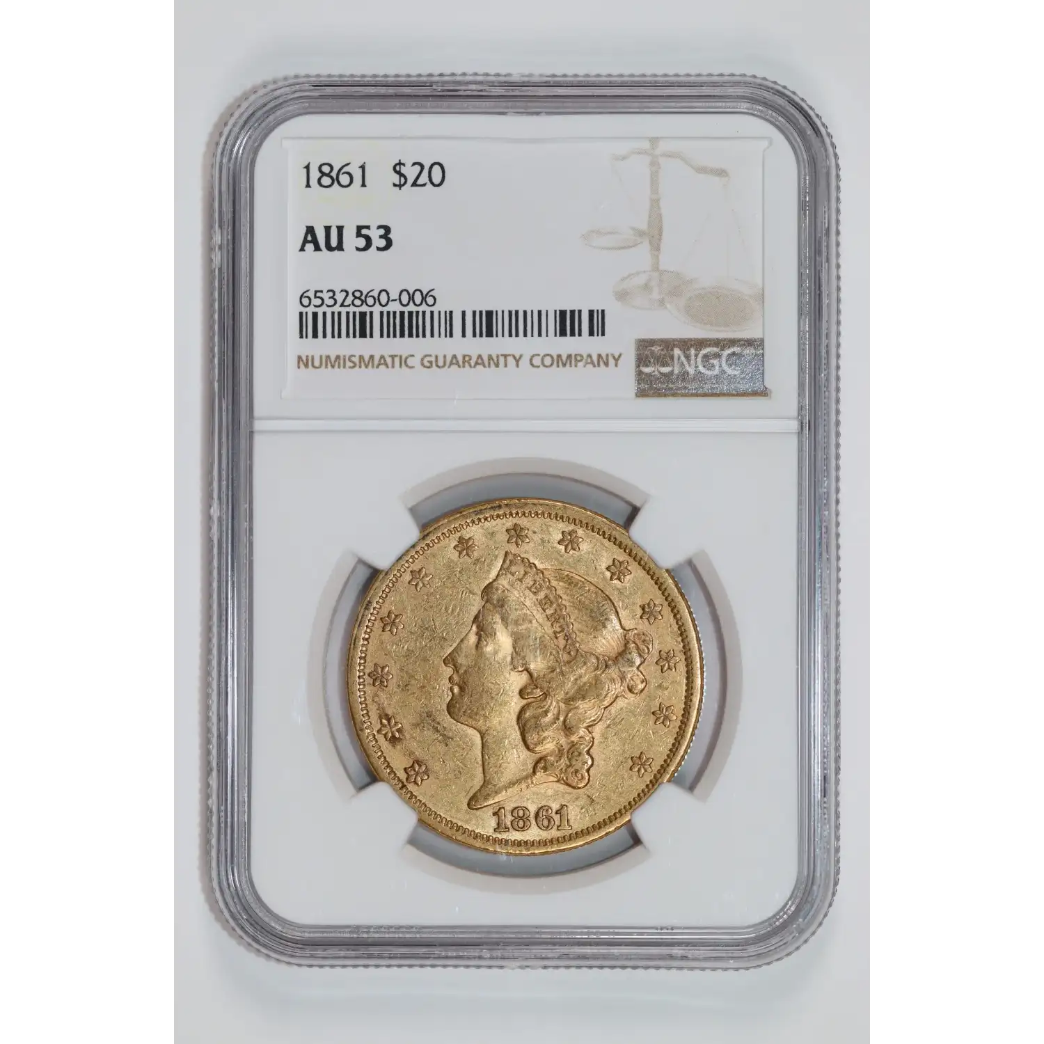 1861 $20 GOLD LIBERTY DOUBLE EAGLE NGC AU53
