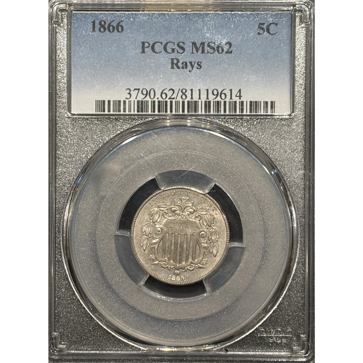 1866 SHIELD NICKEL RAYS PCGS MS62