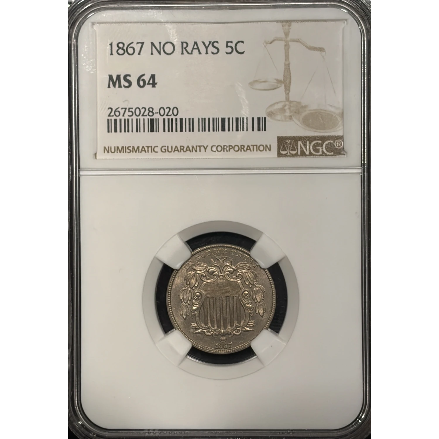 1867 NO RAYS SHIELD NICKEL NGC MS64