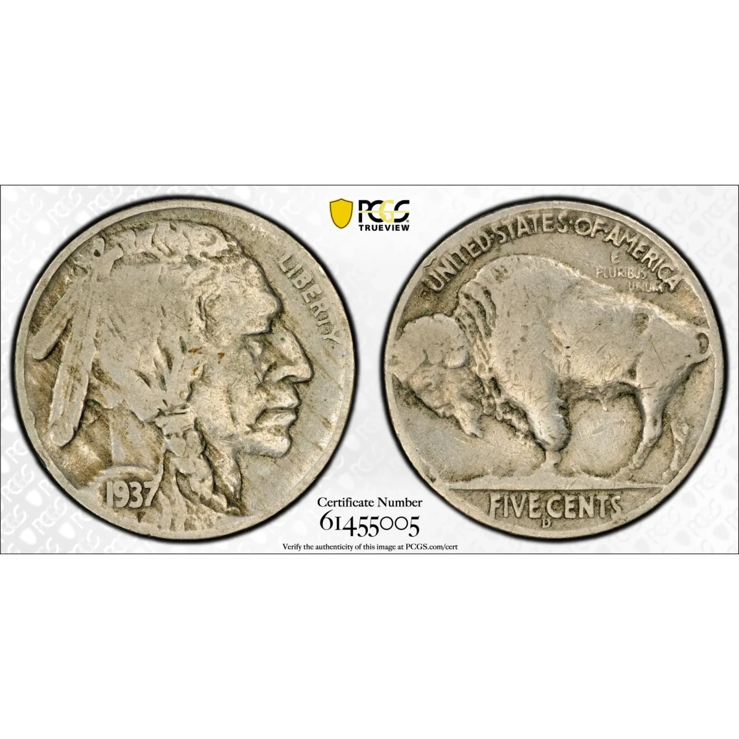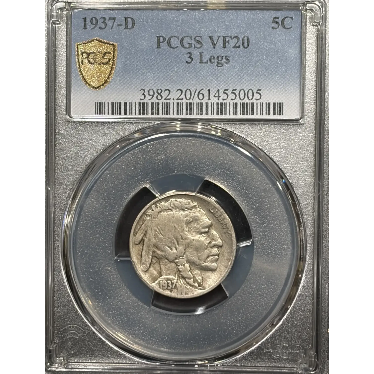 1937-D 3 LEGGED BUFFALO NICKEL PCSG VF20