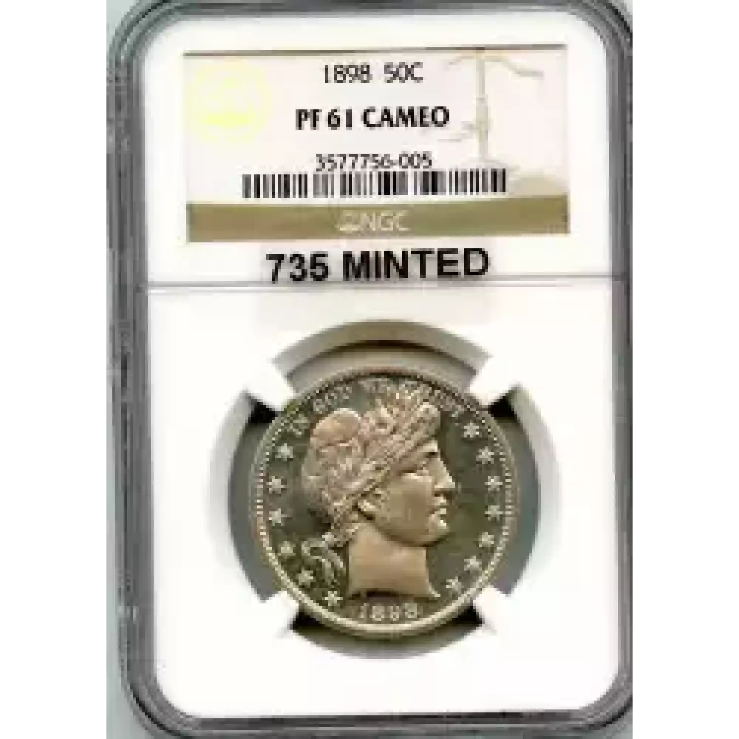 503674 | 1898-PF-63 Barber Half Dollar NGC PF-63 CAM | NGC | PF-63 | Sold: 09/07/2006 | $1,500 |