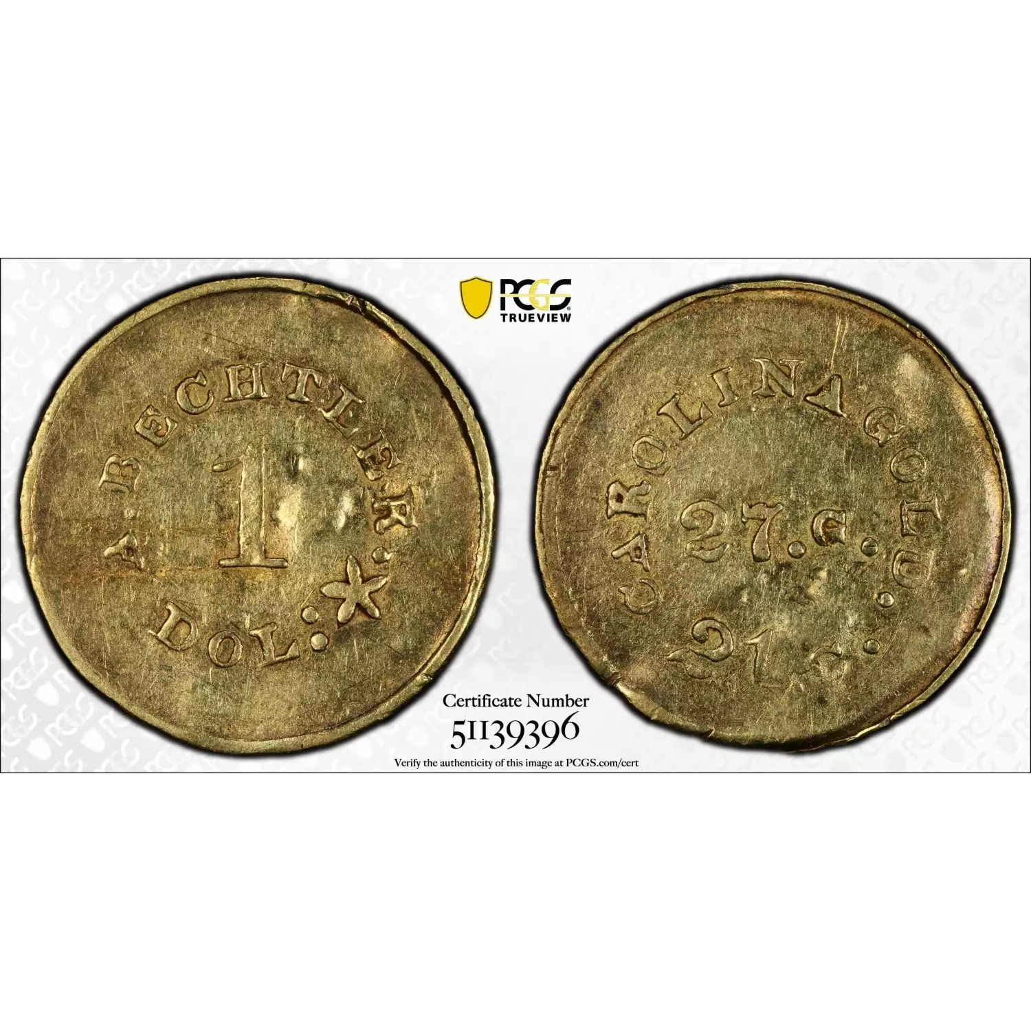 524667 | 1842 Territorial Gold Bechtlers $1 Carolina 27G 21C August Bechtler PCGS Genuine - AU Details (98 - Damage) A. Bechtler, 27.G., 21.C., Plain Edge | PCGS | Genuine - AU Details (98 - Damage) | Sold: 27/02/2025 | $3,000 |
