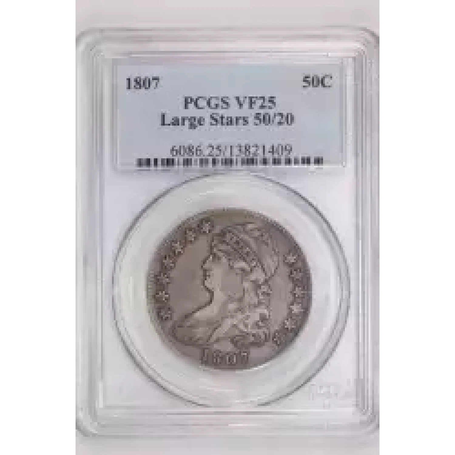 517036 | 1807 Capped Bust Half Dollars PCGS VF-25 Large Stars 50/20 | PCGS | VF-25 | Sold: 19/04/2023 | $850 |