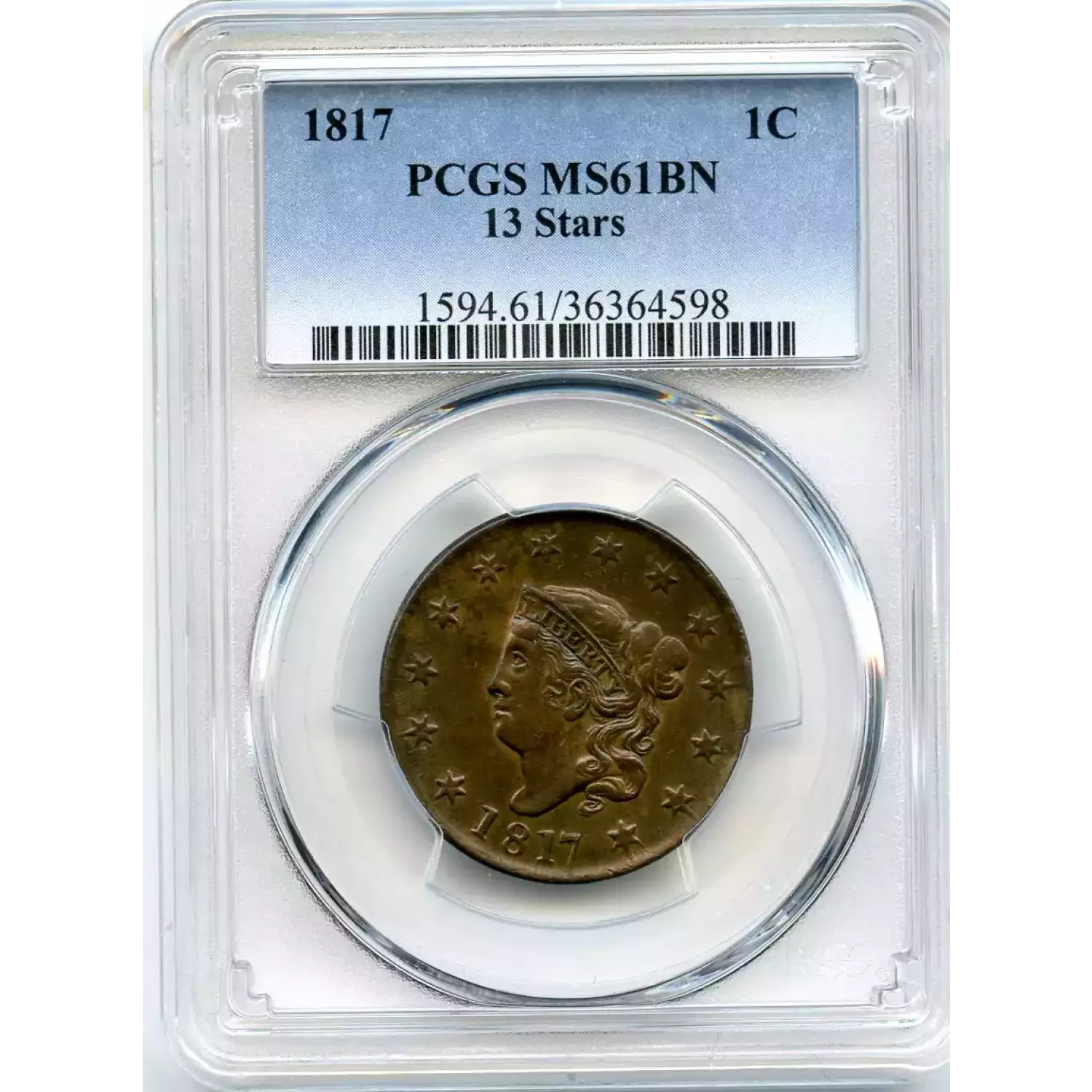 525723 | 1817 Large Cents Coronet Head PCGS MS-62 BN 13 Stars | PCGS | MS-62 | Sold: 09/10/2025 | $1,075 |