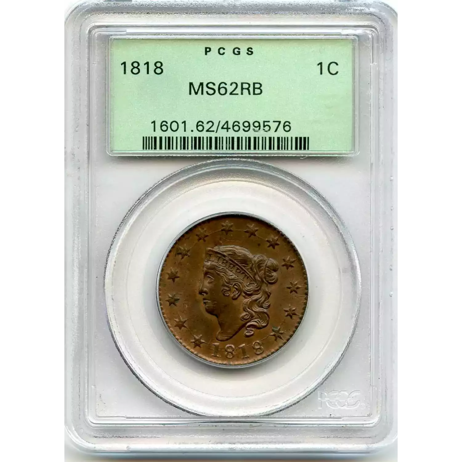 513574 | 1818-MS-62 Large Cents Coronet Head PCGS MS-62 RB | PCGS | MS-62 | Sold: 21/09/2020 | $675 |