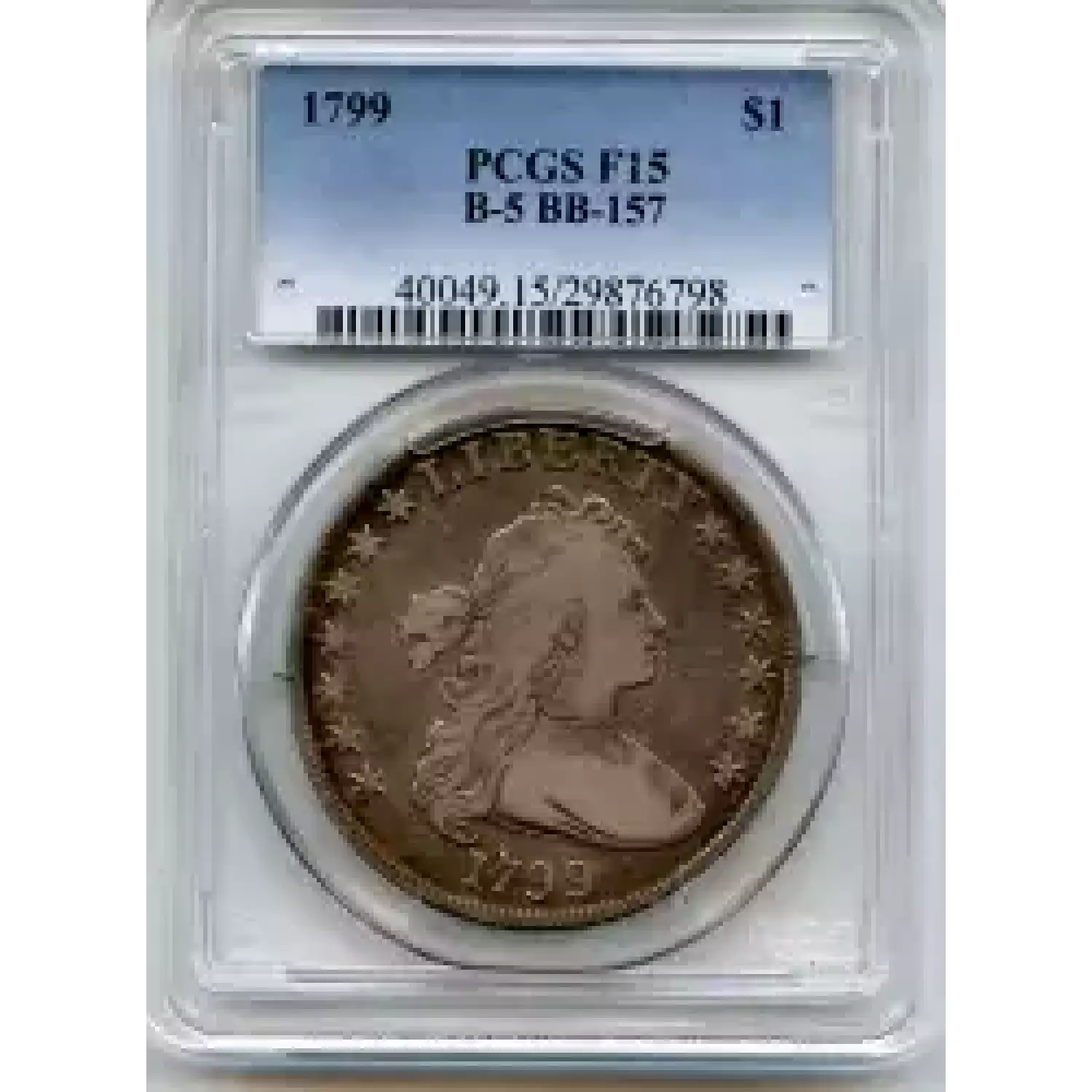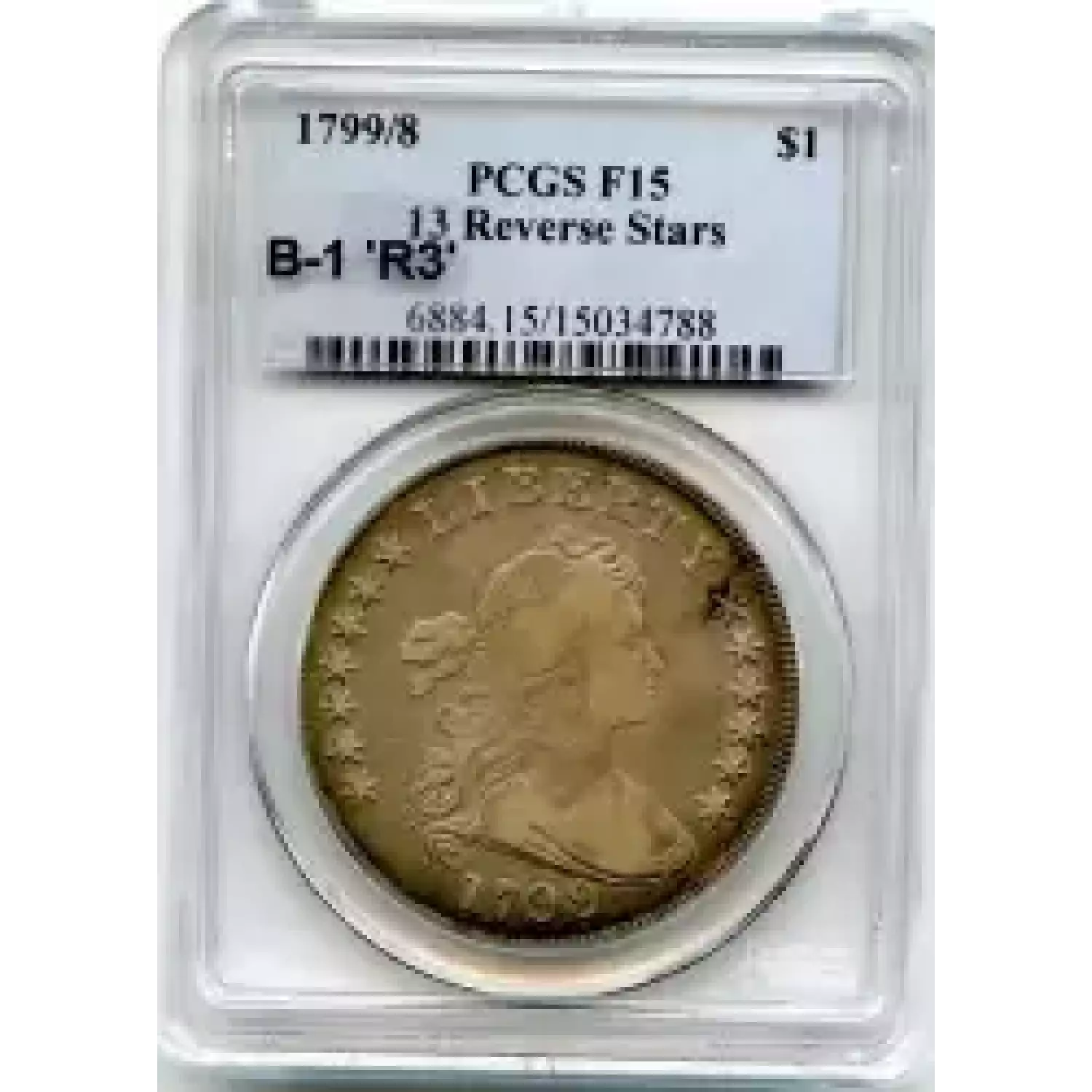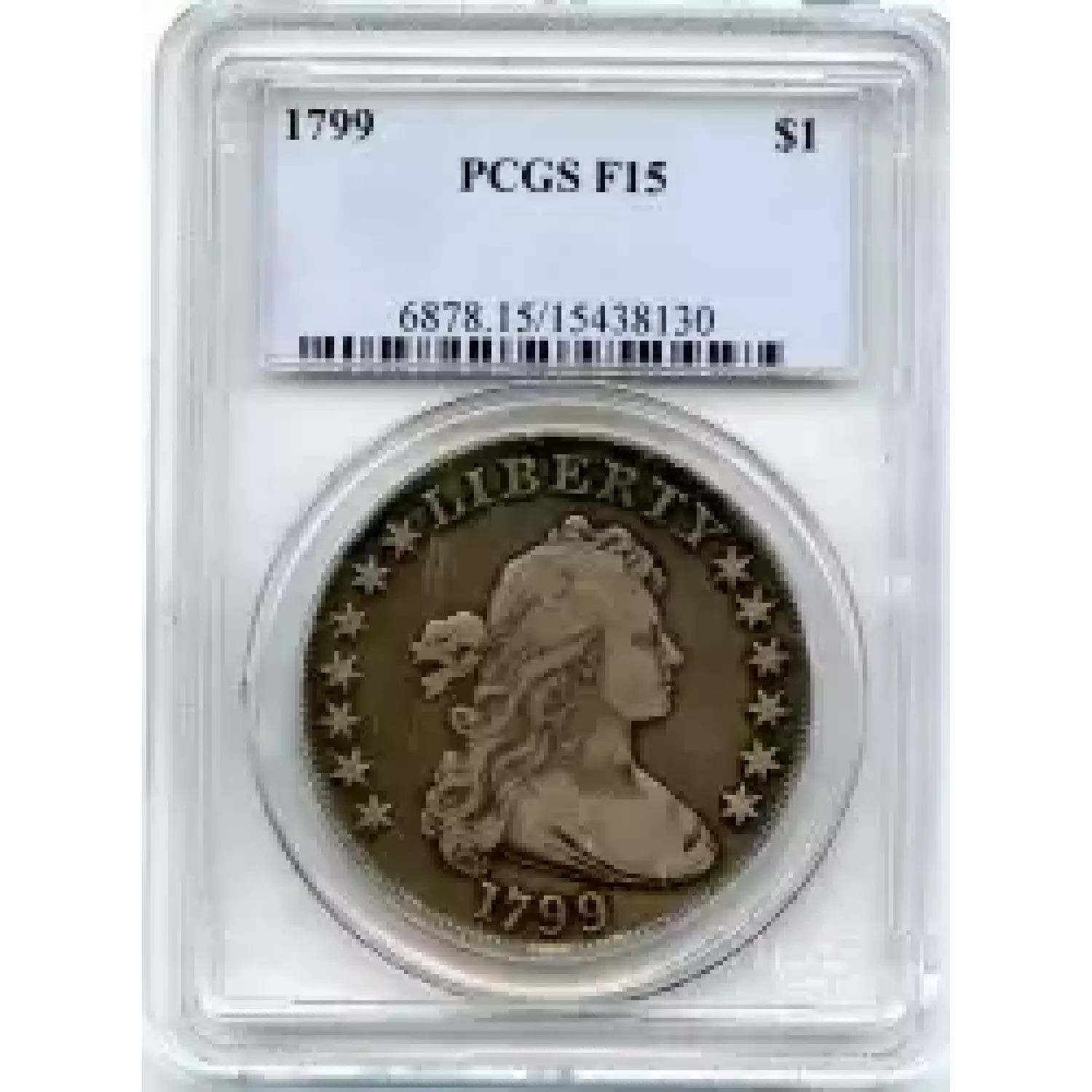 508390 | 1799/8-F-15 Silver Dollars Draped Bust PCGS F-15 | PCGS | F-15 | Sold: 03/05/2015 | $1,750 |