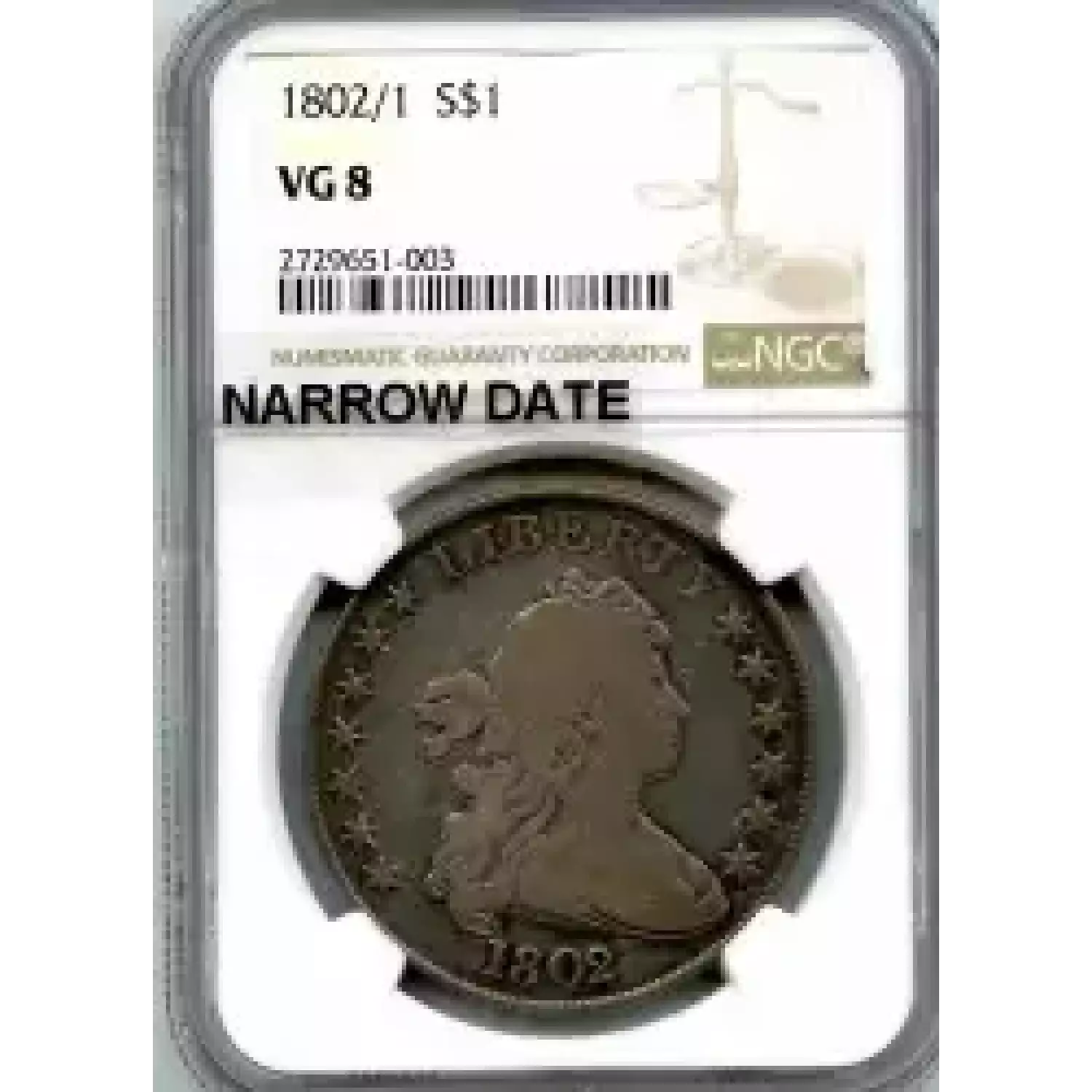 511220 | 1802/1-VG-8 Silver Dollars Draped Bust NGC VG-8 | NGC | VG-8 | Sold: 16/04/2018 | $1,250 |