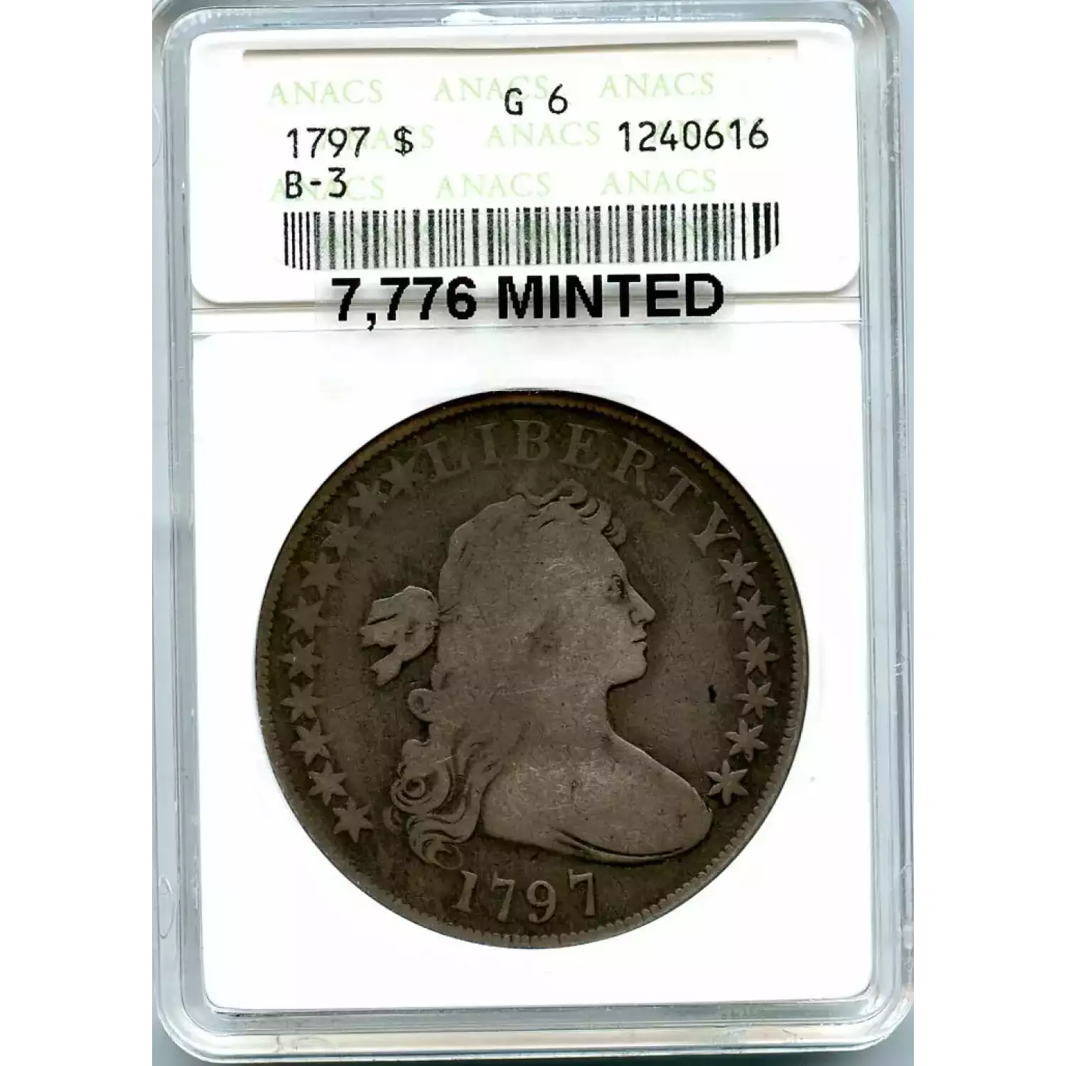 512509 | 1797-G-6 Silver Dollars Draped Bust ANACS G-6 | ANACS | G-6 | Sold: 20/03/2019 | $1,700 |