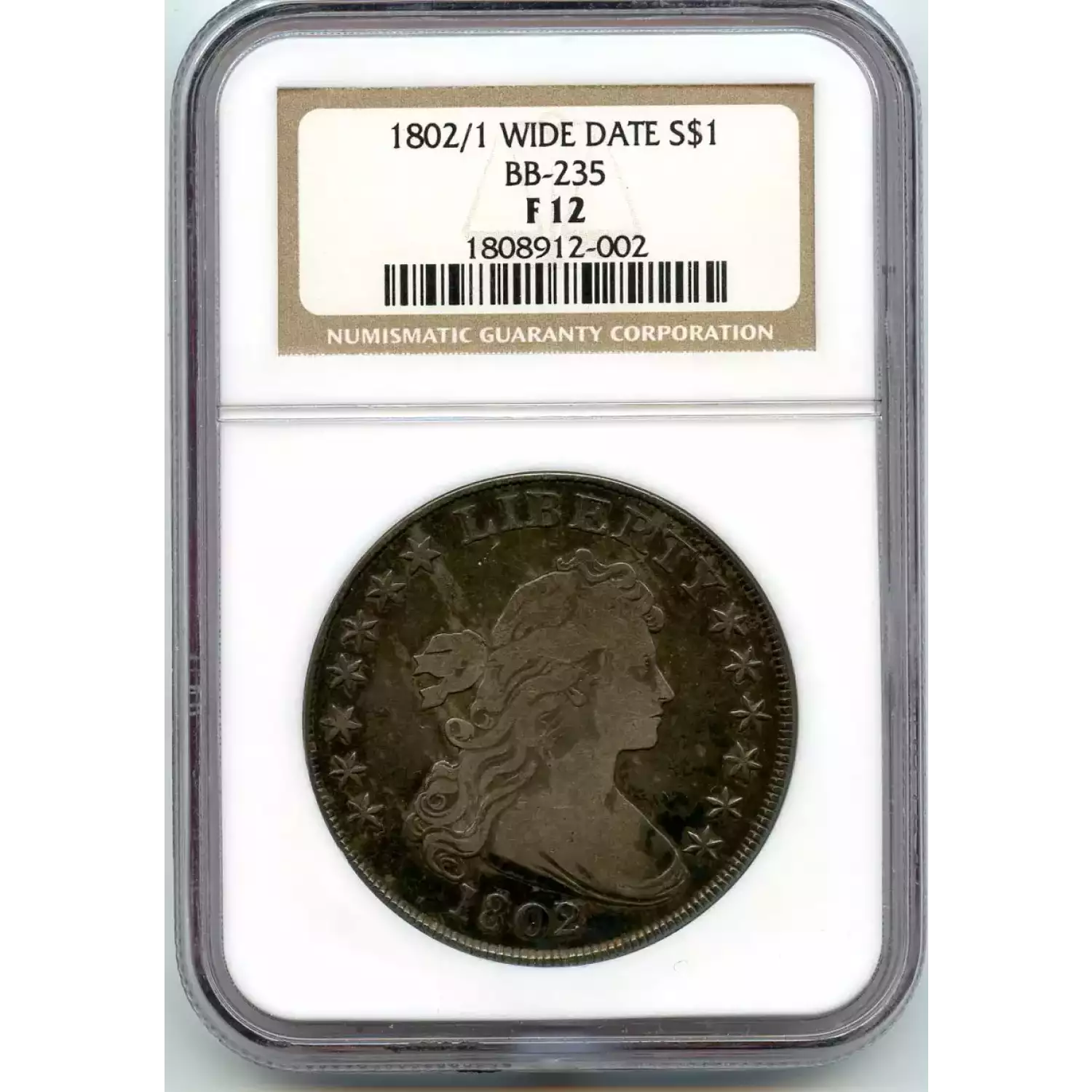 512652 | 1802-F-12 Silver Dollars Draped Bust NGC F-12 | NGC | F-12 | Sold: 29/07/2019 | $1,575 |