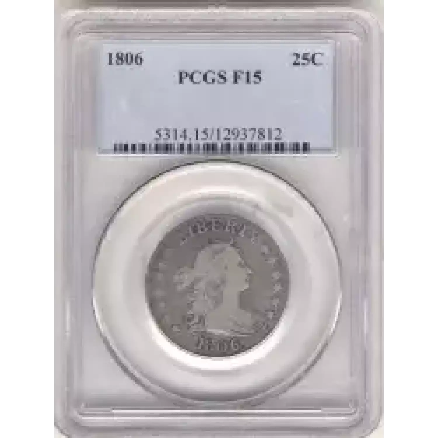 505804 | 1806-F-15 Quarter Dollars Draped Bust PCGS F-15 | PCGS | F-15 | Sold: 06/01/2012 | $975 |
