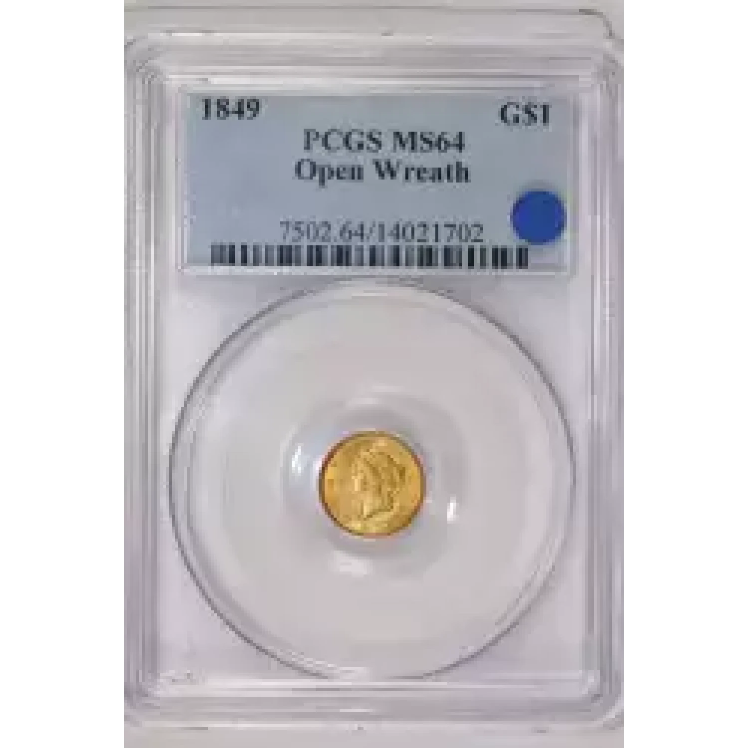 501505 | 1849 Gold Dollars Liberty Head PCGS MS-64 Open Wreath | PCGS | MS-64 | Sold: 09/02/2023 | $2,100 |