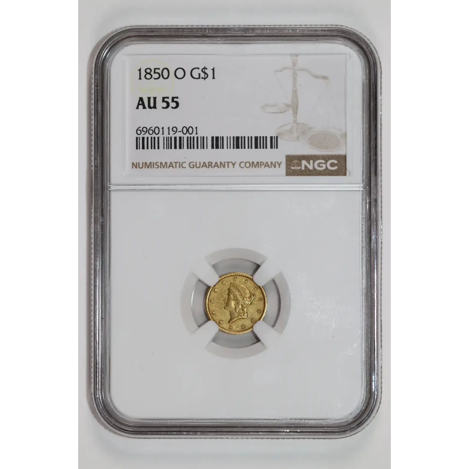 535627 | 1850-O Gold Dollars Liberty Head NGC AU-55 | NGC | AU-55 | Sold: 14/10/2025 | $2,250 |