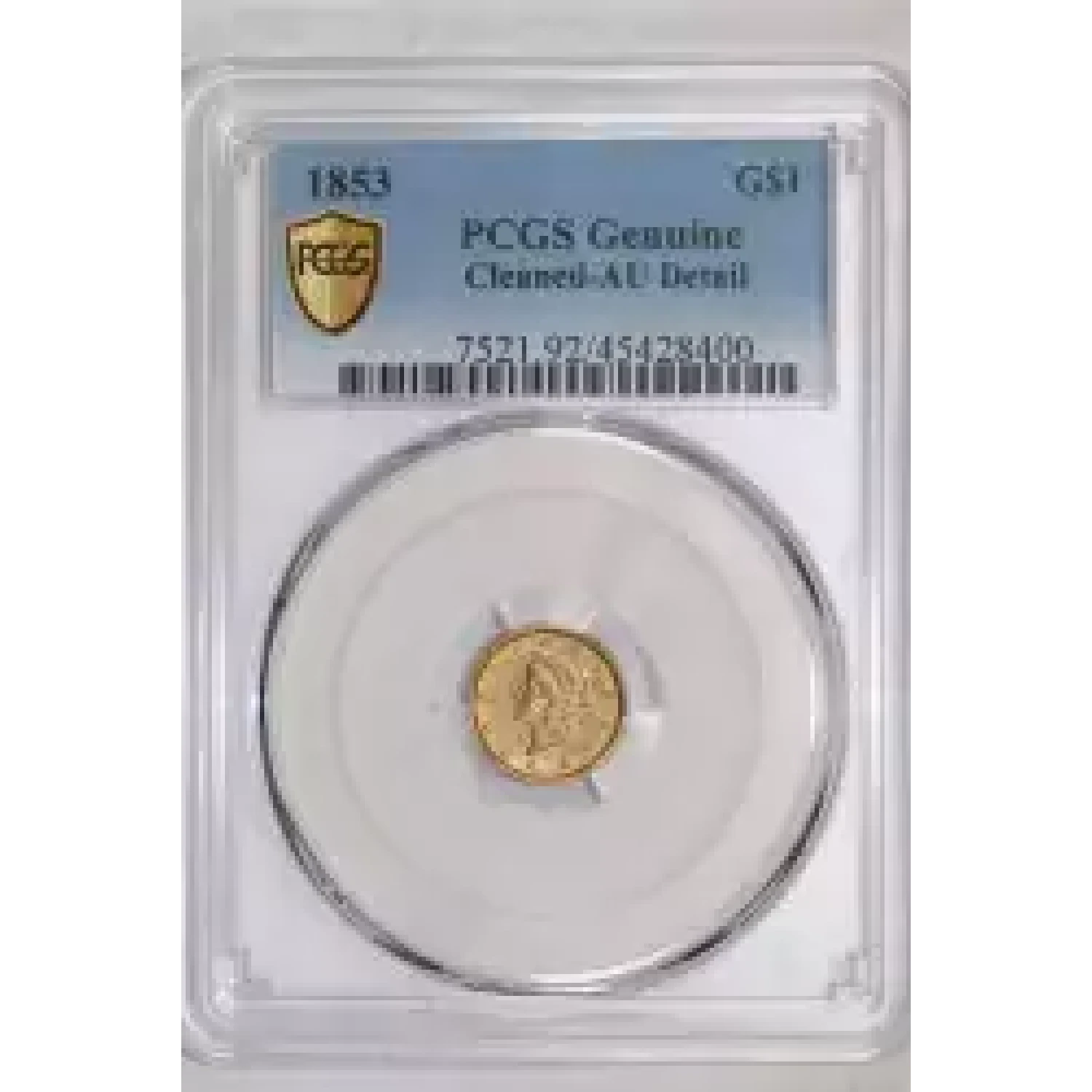 515289 | 1853 Gold Dollars Liberty Head PCGS Genuine - AU Details (92 - Cleaned) | PCGS | Genuine - AU Details (92 - Cleaned) | Sold: 28/09/2022 | $315 |