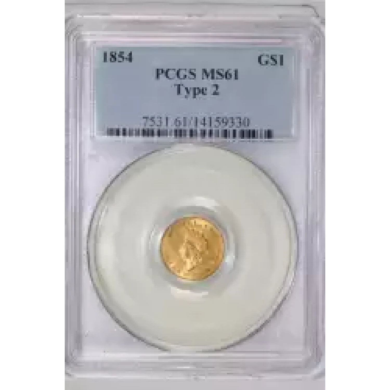 501506 | 1854 Gold Dollars Indian Princess Head, Small Head PCGS MS-61 Type 2 | PCGS | MS-61 | Sold: 13/02/2023 | $2,000 |