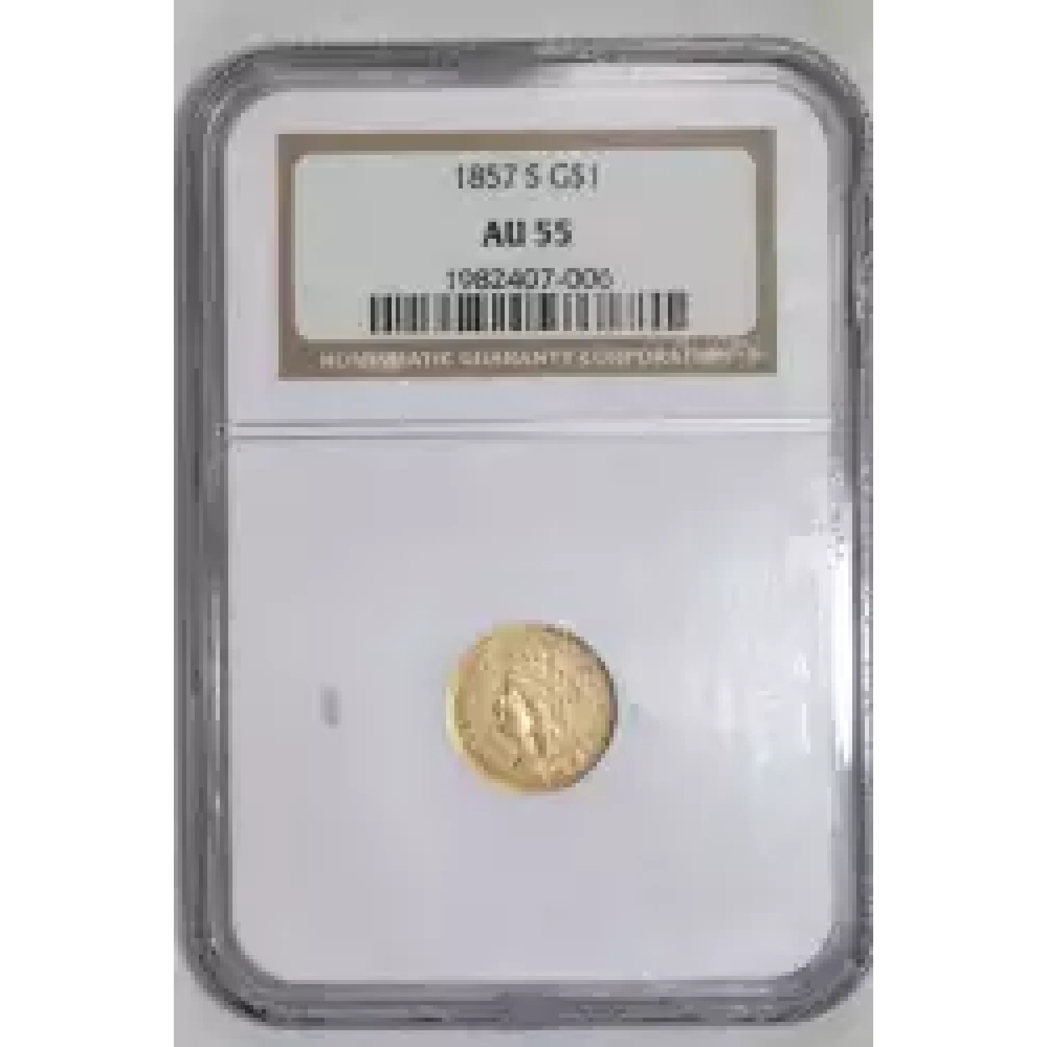517754 | 1857-S Indian Princess Large Head Gold Dollar NGC AU-55 | NGC | AU-55 | Sold: 13/09/2023 | $2,200 |