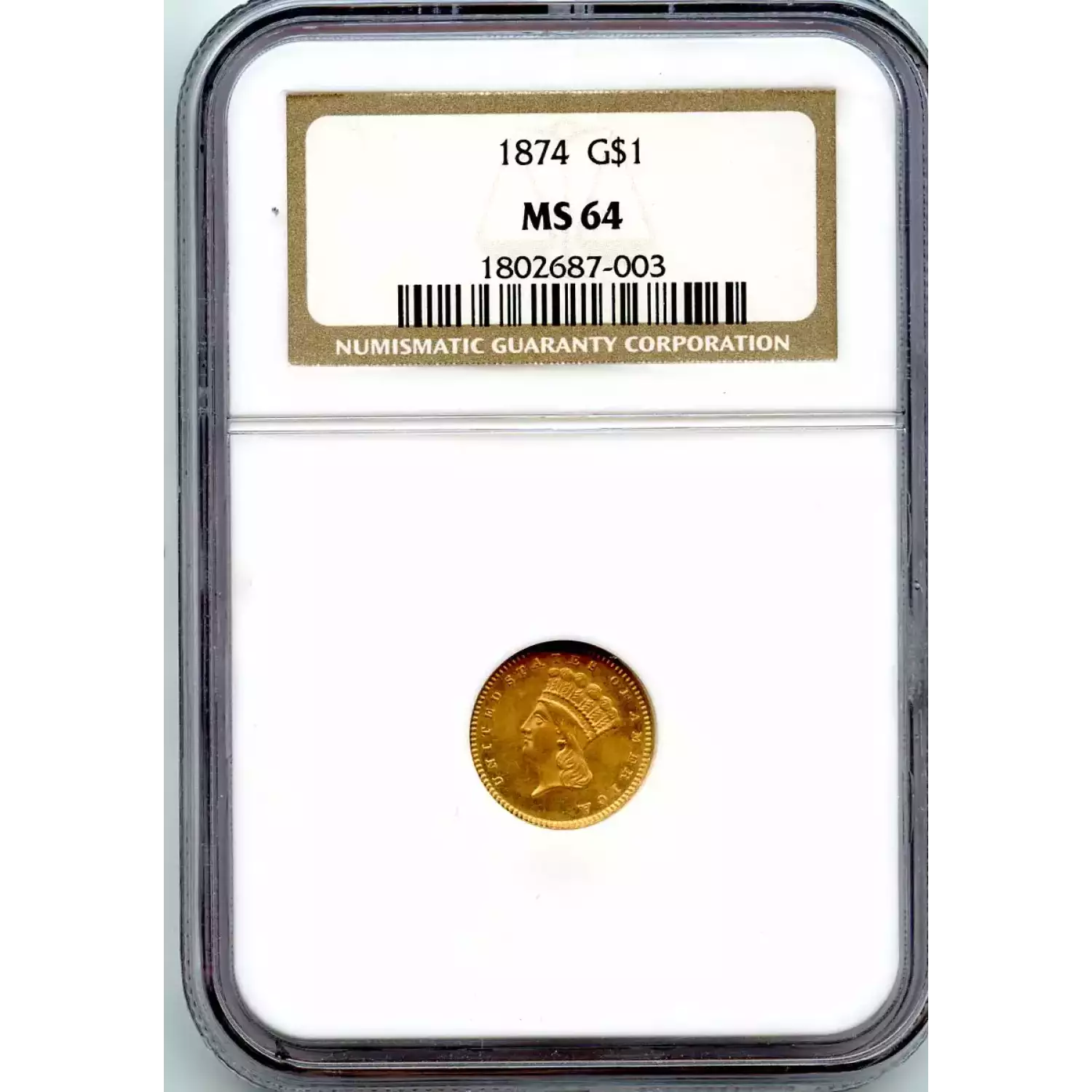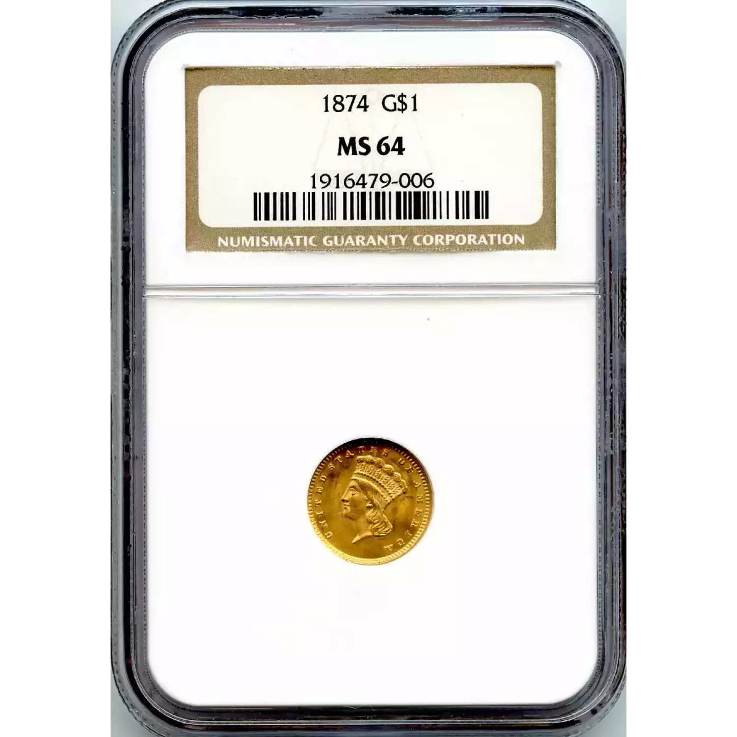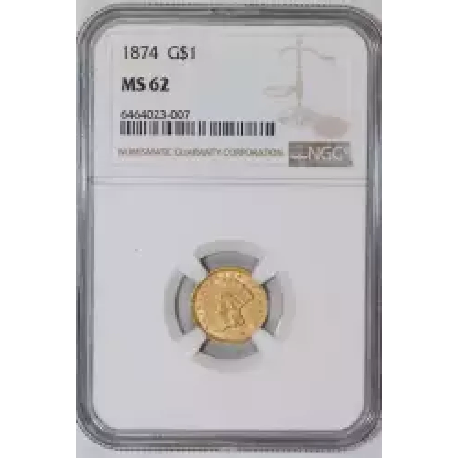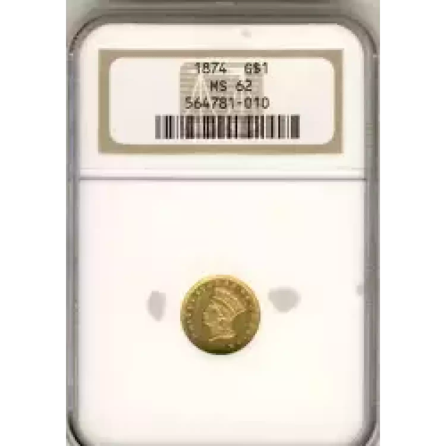 503978 | 1874-MS-62 Indian Princess Large Head Gold Dollar NGC MS-62 | NGC | MS-62 | Sold: 31/12/2006 | |