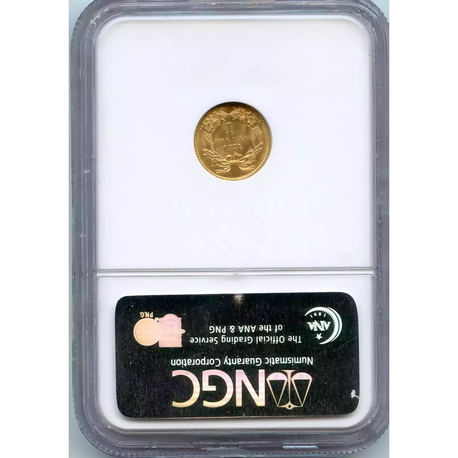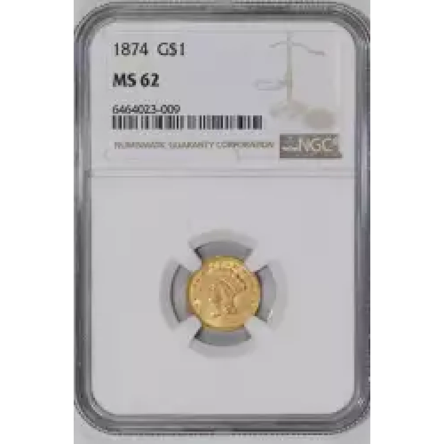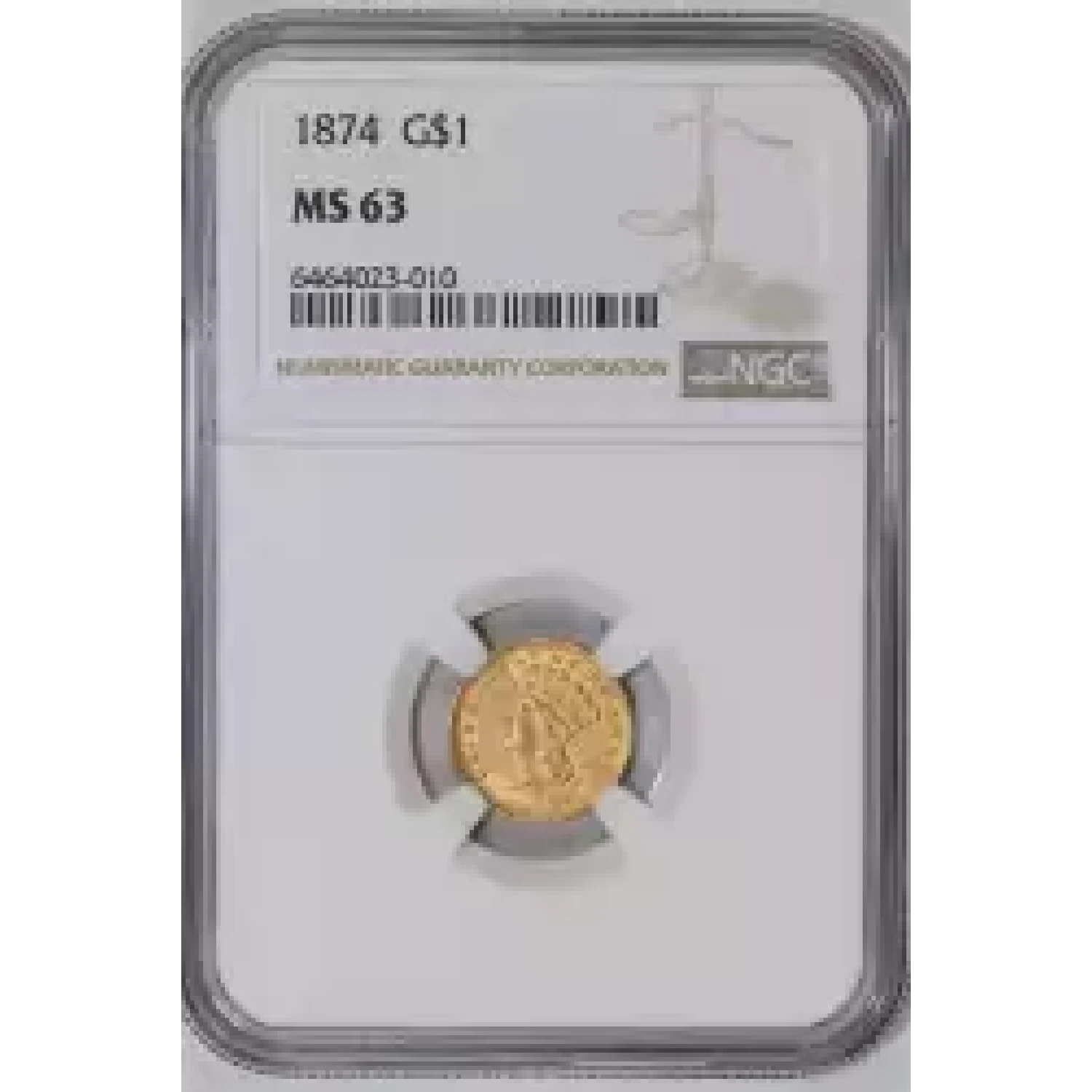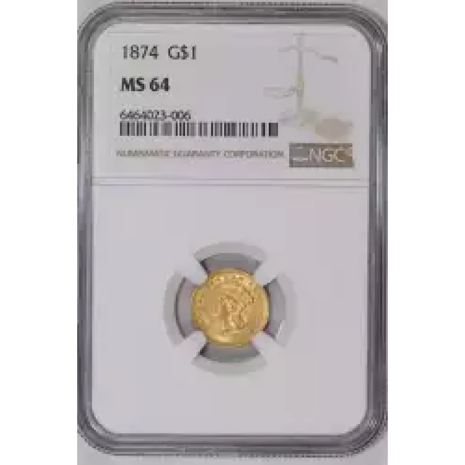 503978 | 1874-MS-62 Indian Princess Large Head Gold Dollar NGC MS-62 | NGC | MS-62 | Sold: 31/12/2006 | |