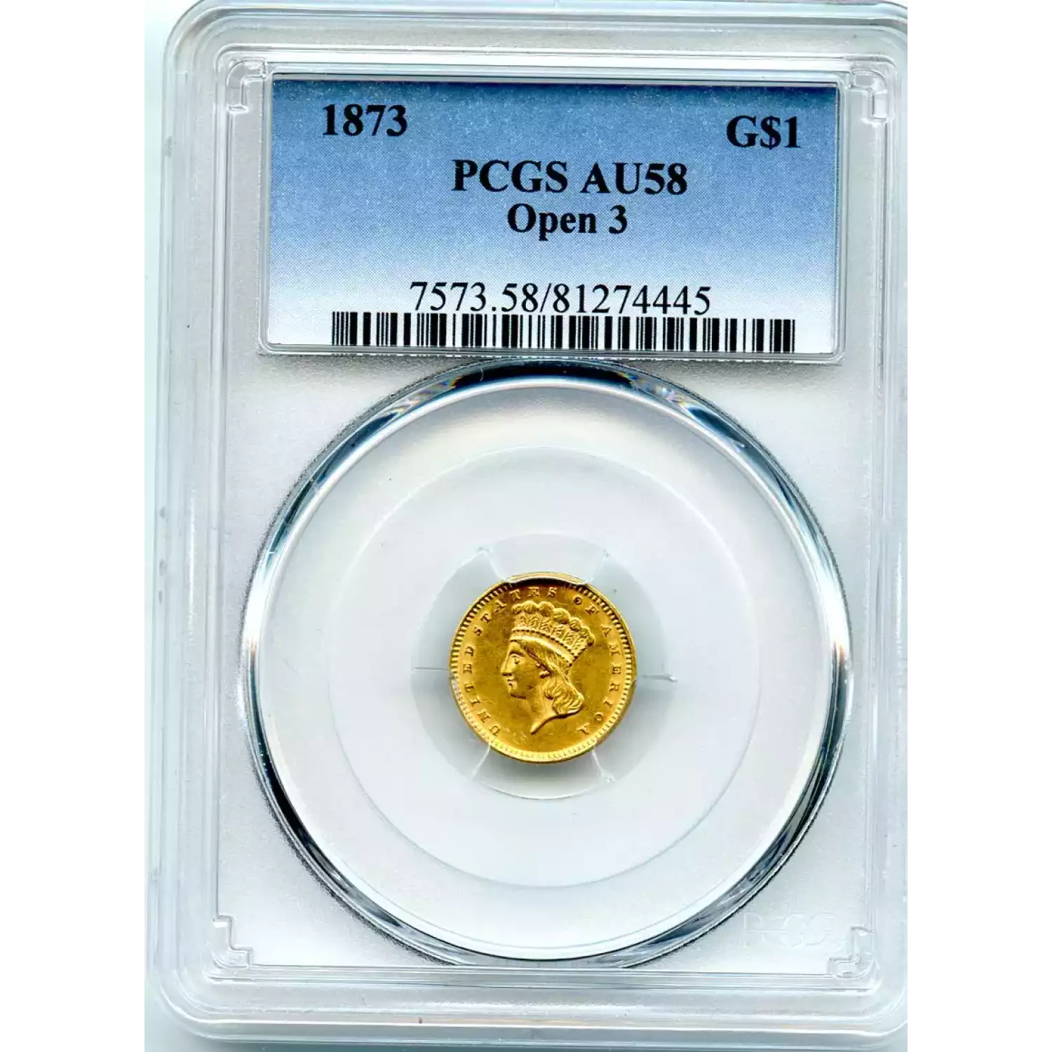 508876 | 1873-AU-58 Indian Princess Large Head Gold Dollar PCGS AU-58 CAC | PCGS | AU-58 | Sold: 22/08/2015 | $900 |