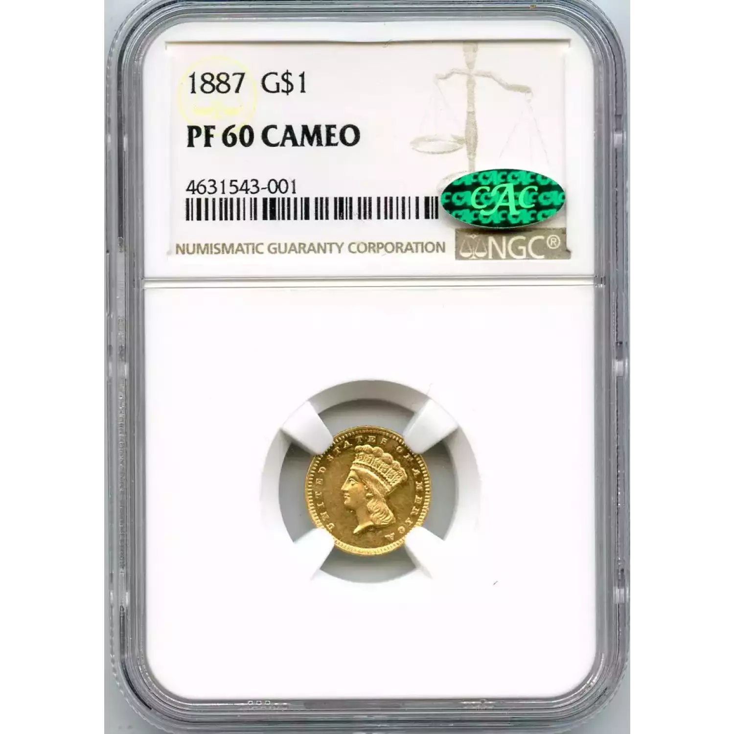 513103 | 1887-PR-60 Indian Princess Large Head Gold Dollar NGC PR-60 CAM CAC | NGC | PR-60 | Sold: 09/12/2019 | $2,650 |