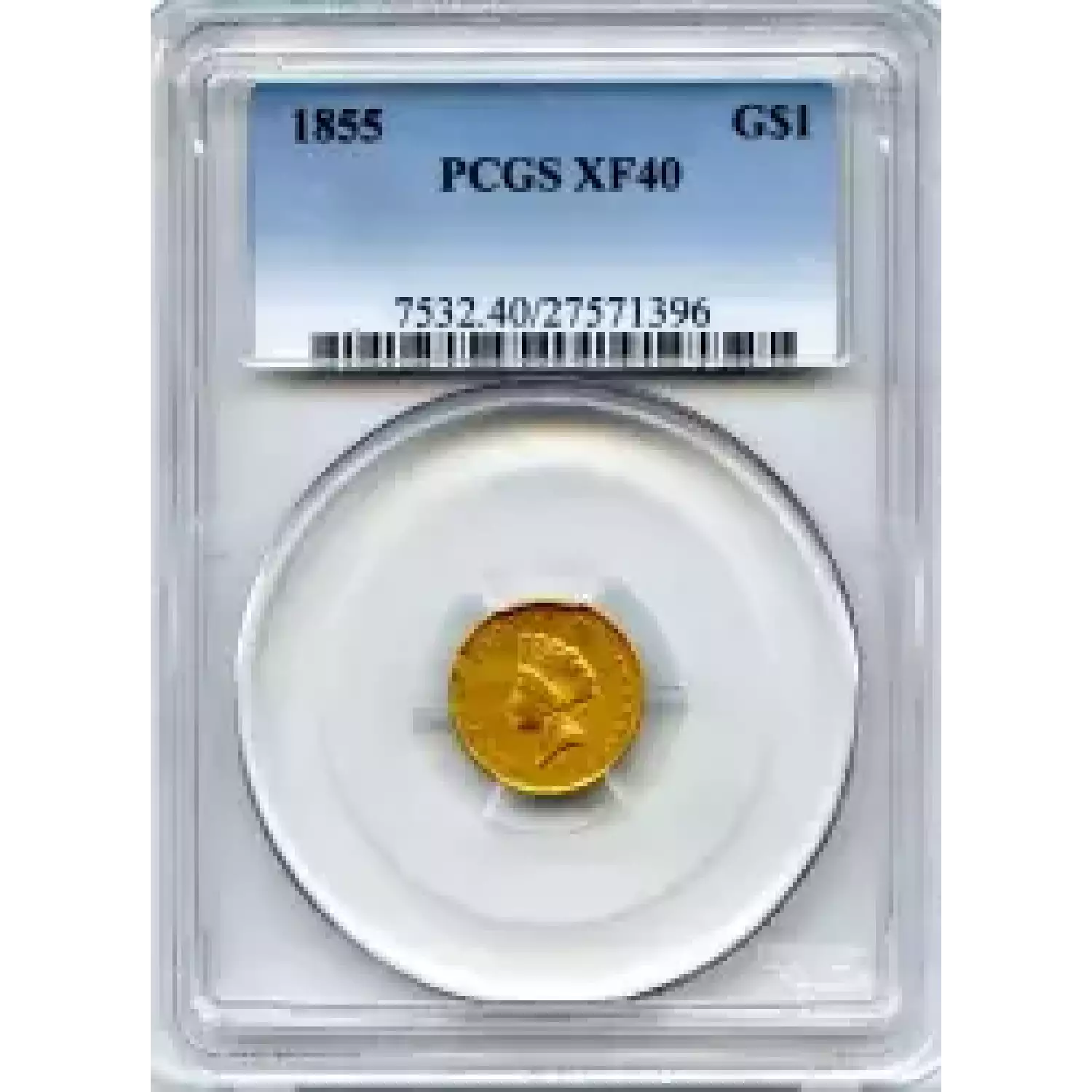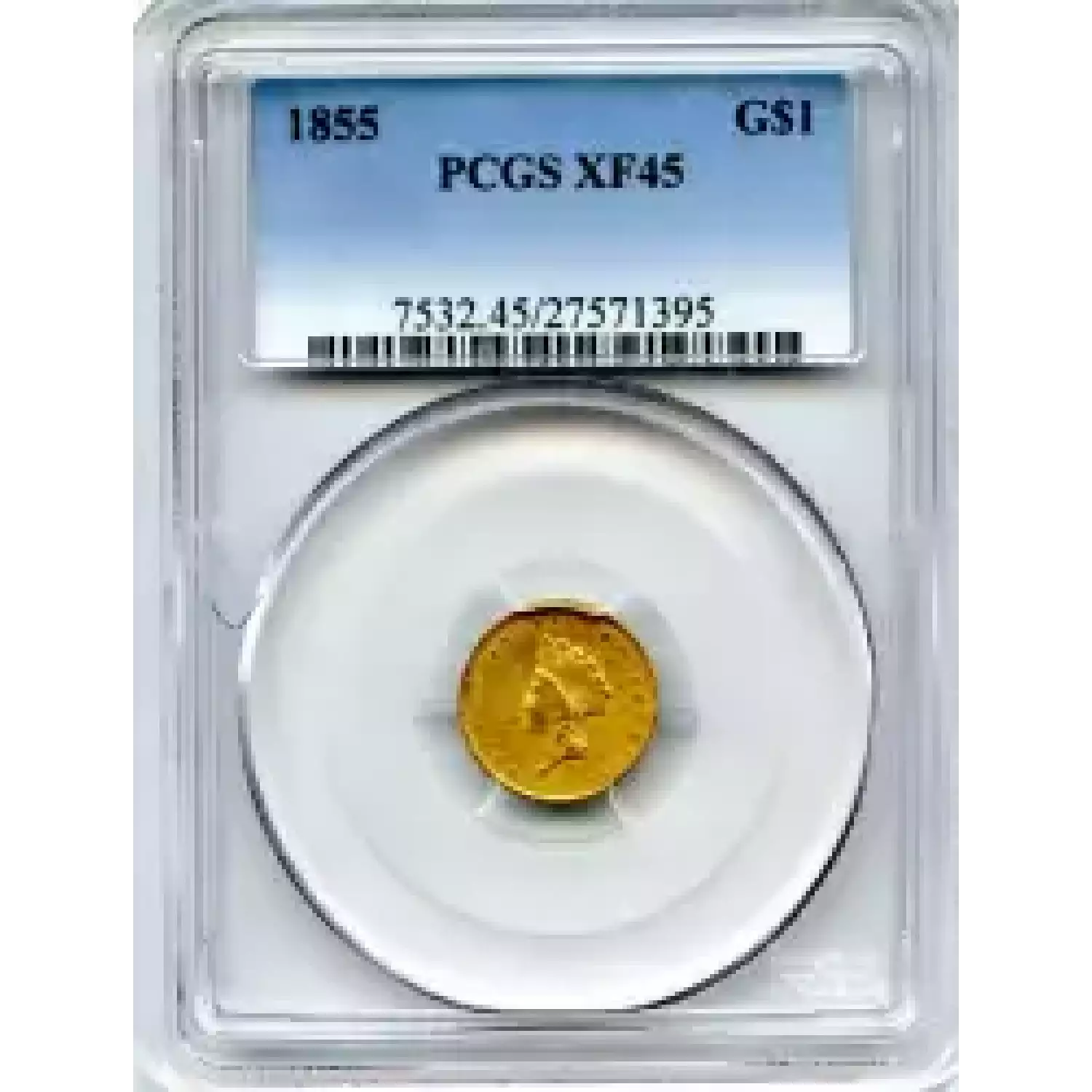 507134 | 1855-XF-40 Gold Dollars Indian Princess Head, Small Head PCGS XF-40 | PCGS | XF-40 | Sold: 12/01/2014 | $340 |