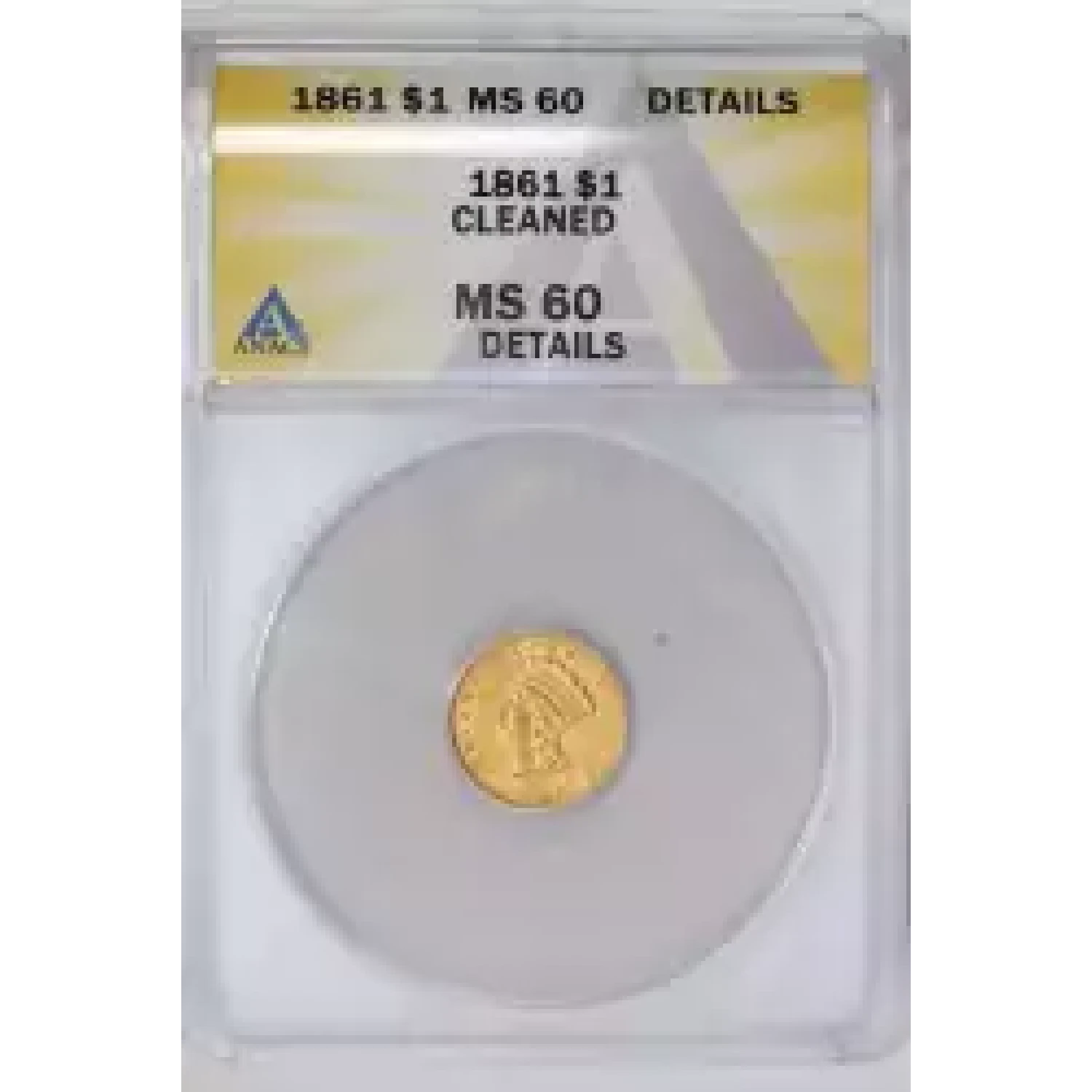 501972 | 1861 Gold Dollars Liberty Head ANACS Genuine (92 - Cleaning) | ANACS | Genuine (92 - Cleaning) | Sold: 09/06/2022 | $475 |