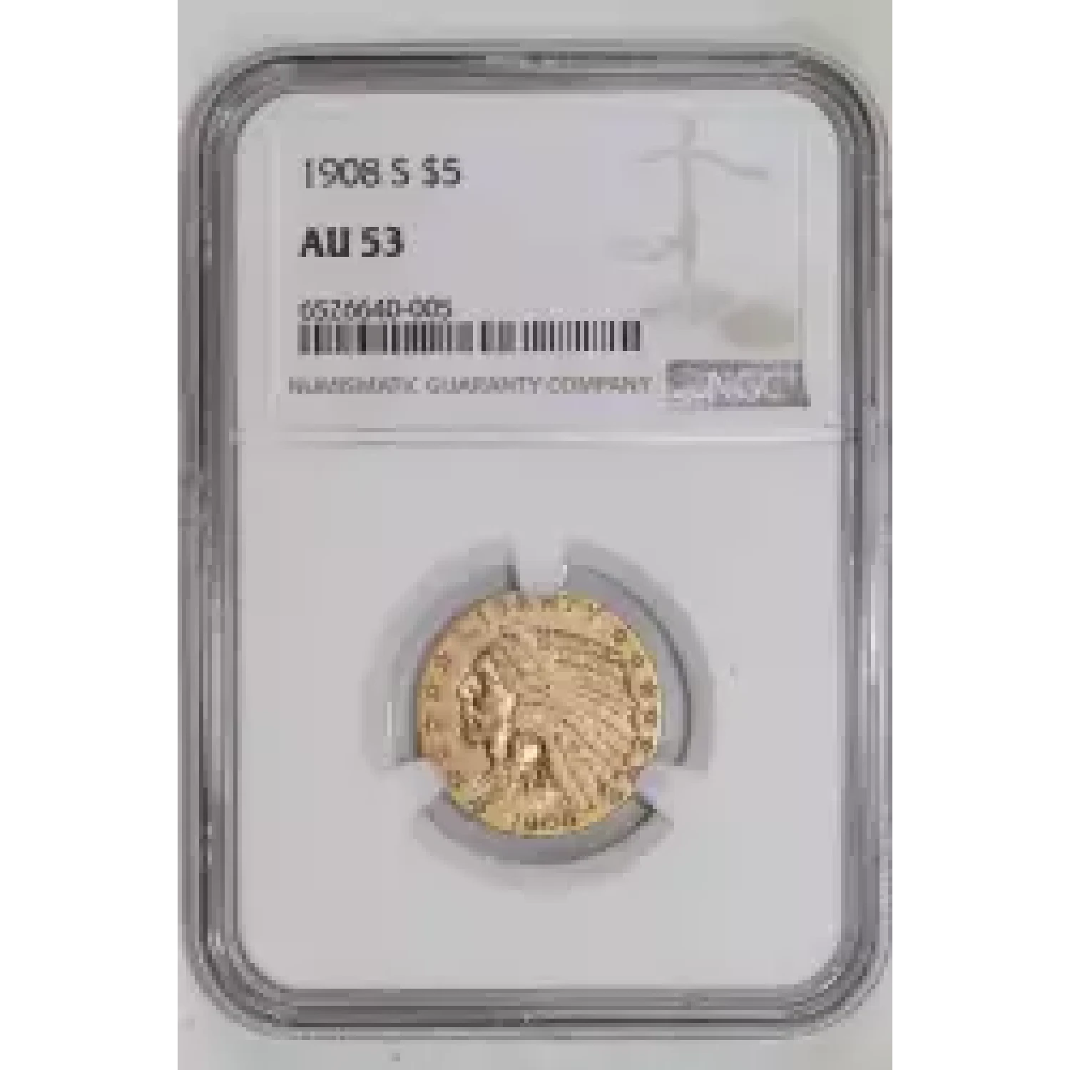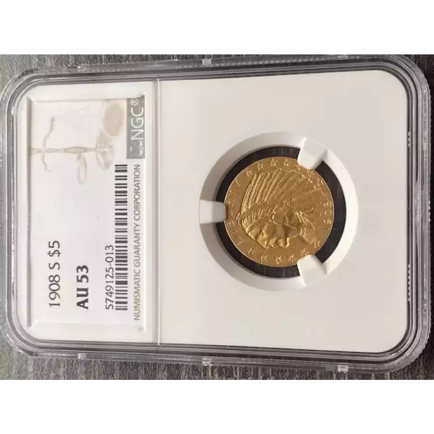 519128 | 1908-S Gold Half Eagles $5 Indian Head NGC AU-53 | NGC | AU-53 | Sold: 14/12/2023 | $2,350 |