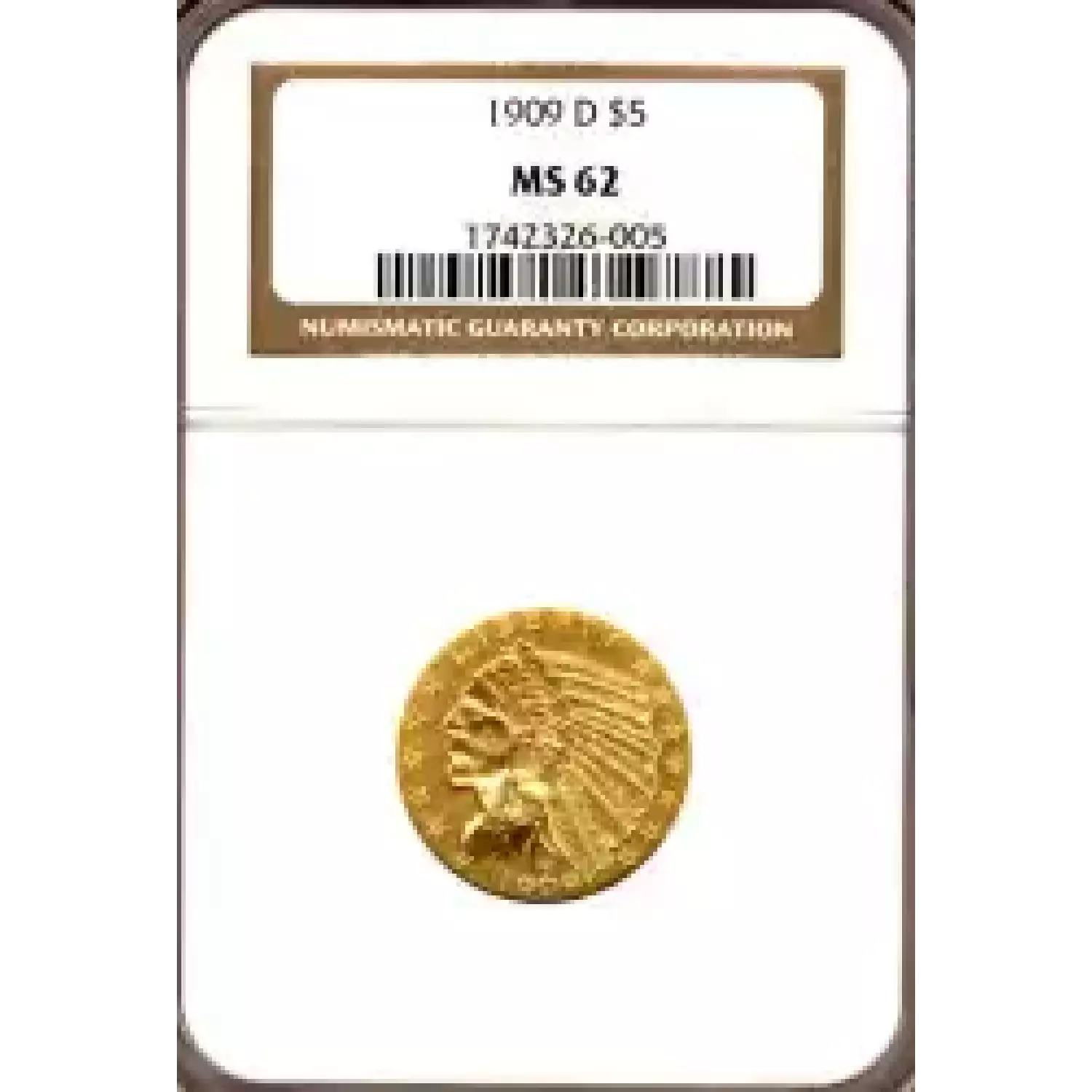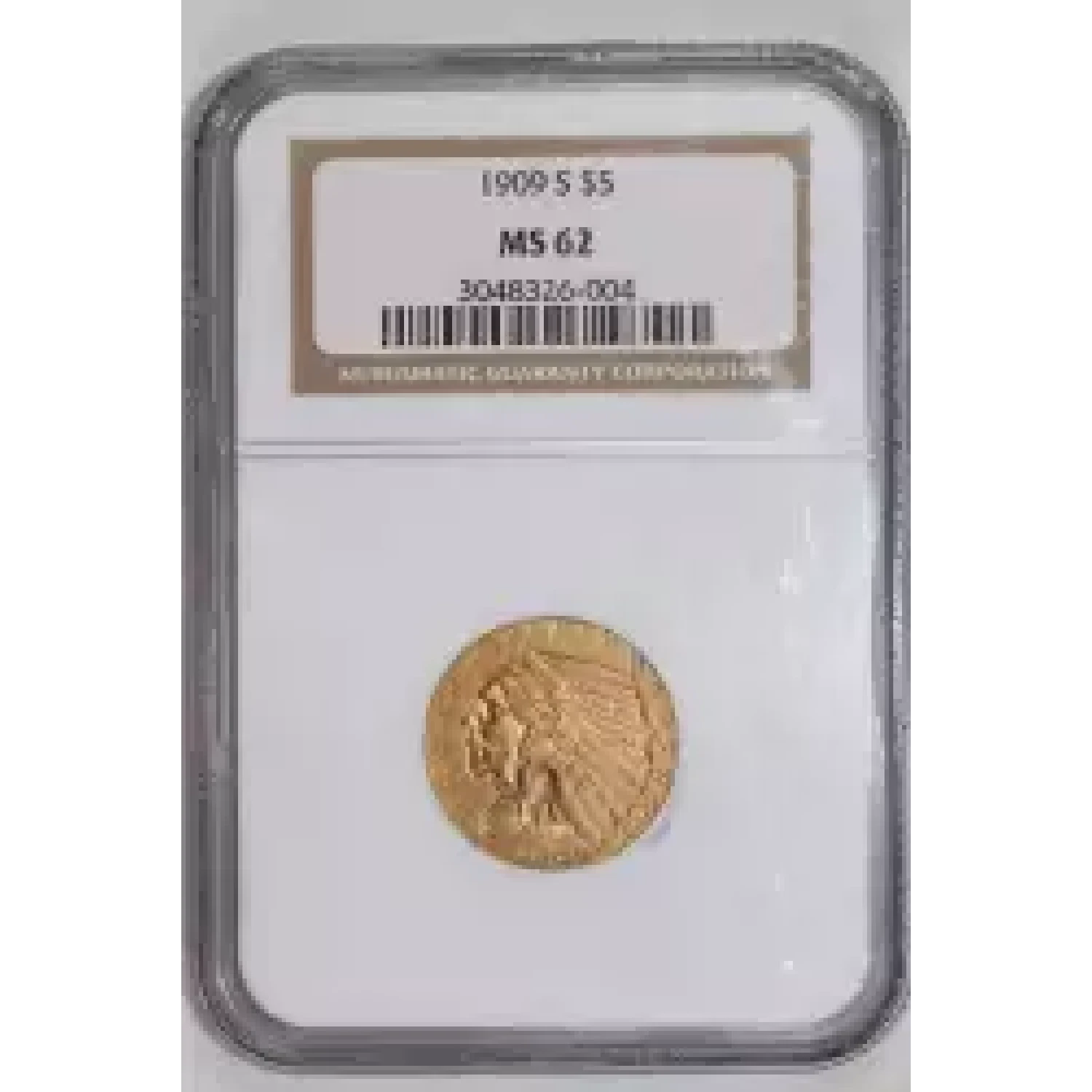 517165 | 1909-S Gold Half Eagles $5 Indian Head NGC MS-62 | NGC | MS-62 | Sold: 10/03/2023 | $10,000 |