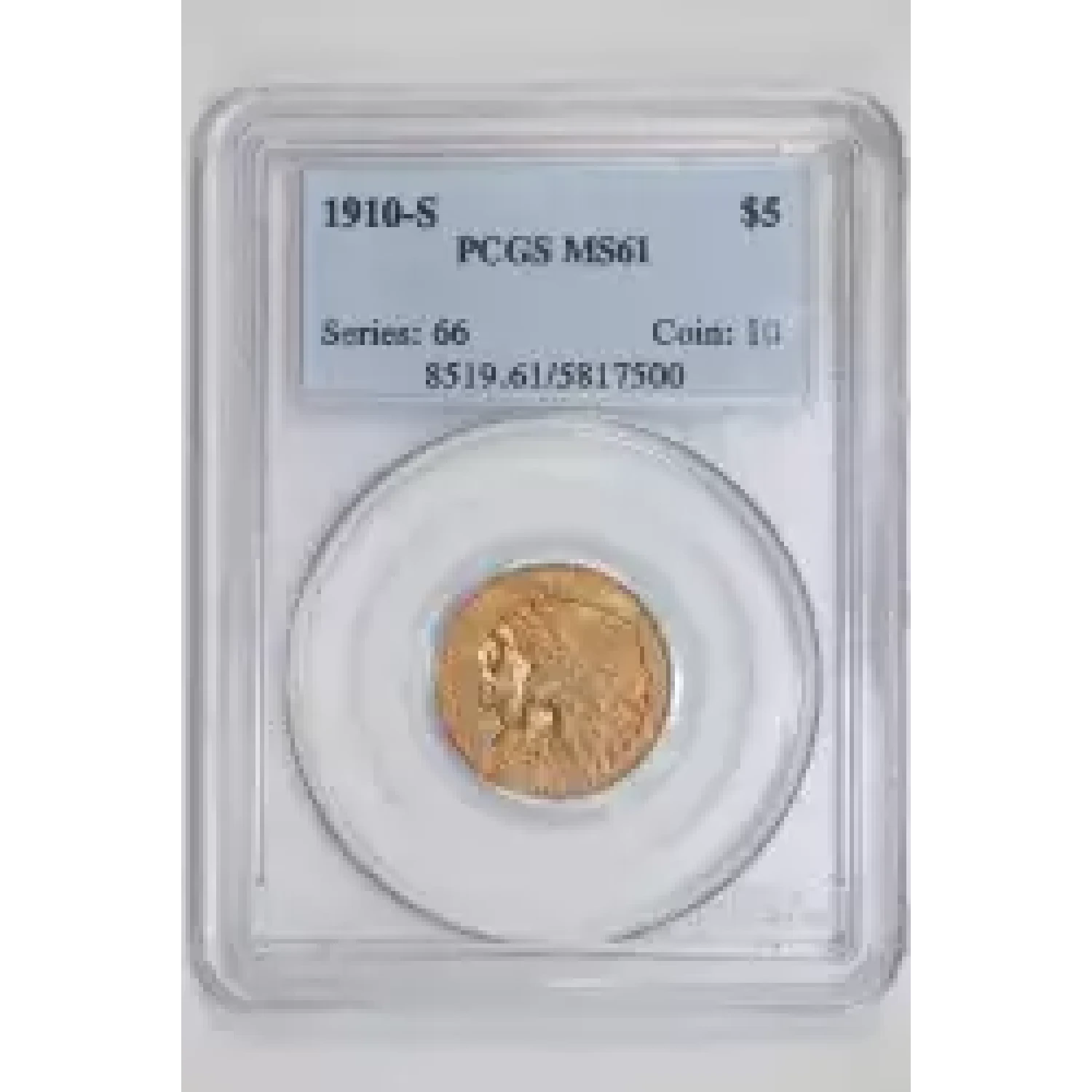 523840 | 1910-S Gold Half Eagles $5 Indian Head PCGS MS-61 | PCGS | MS-61 | Sold: 19/03/2025 | $1,850 |
